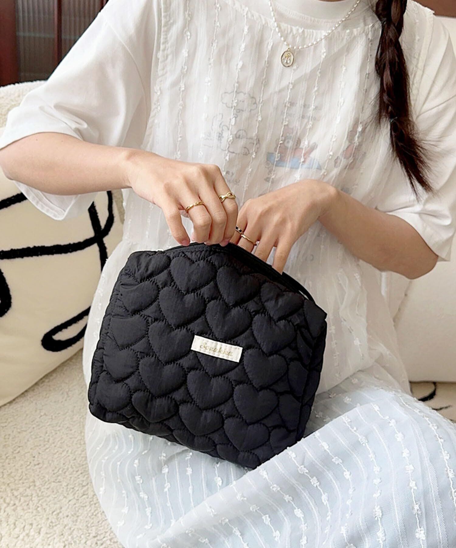 【大容量/手洗い可◎/シャーベットカラーがかわいいマルチポーチ/化粧ポーチ】ハートキルティングふっくら大きめポーチ。