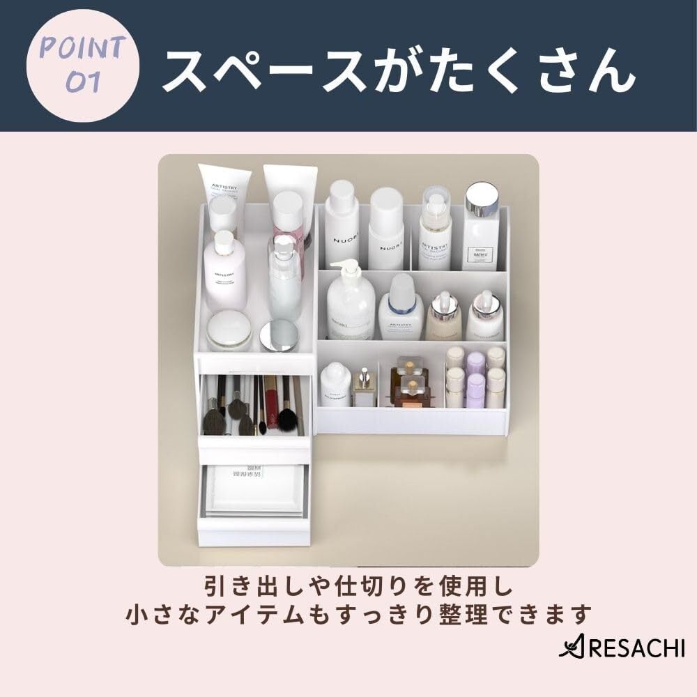 【たっぷり収納】化粧品や小物をたくさん収納できる大容量の設計です。引き出しや仕切りがたくさんあるので、リップやアイシャドウなどの小さなアイテムもすっきり整理できます。