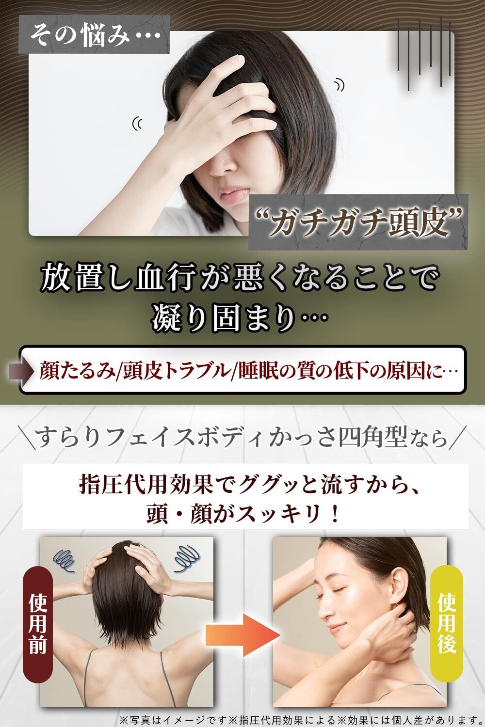 【商品基本仕様】ガチガチ頭にアプローチ!ゴリゴリはがす 頭皮マッサージ に特化した カッサ 四角型。指圧代用効果によりググッと流すから、頭・顔がスッキリ!さらに、1秒間に1兆回振動するテラヘルツ波の効果も期待できます。