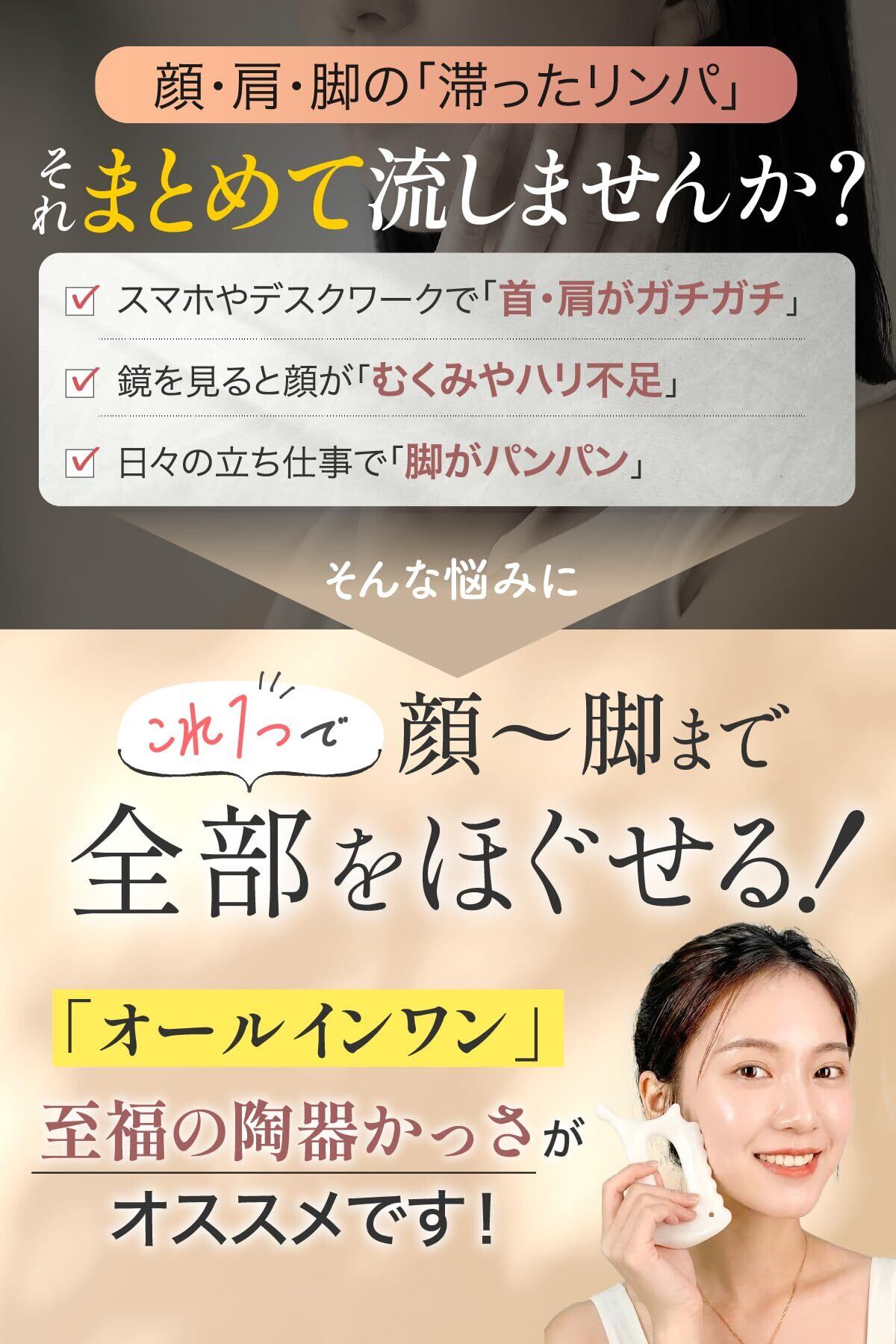 【もたつきへの物理的アプローチ】 気になるもたつきに対し、カッサ特有の面で押し流す物理的な刺激を与えることで、シャープな印象を目指します。複雑な操作が必要ないため、今日からすぐに始められる簡単美容法です。