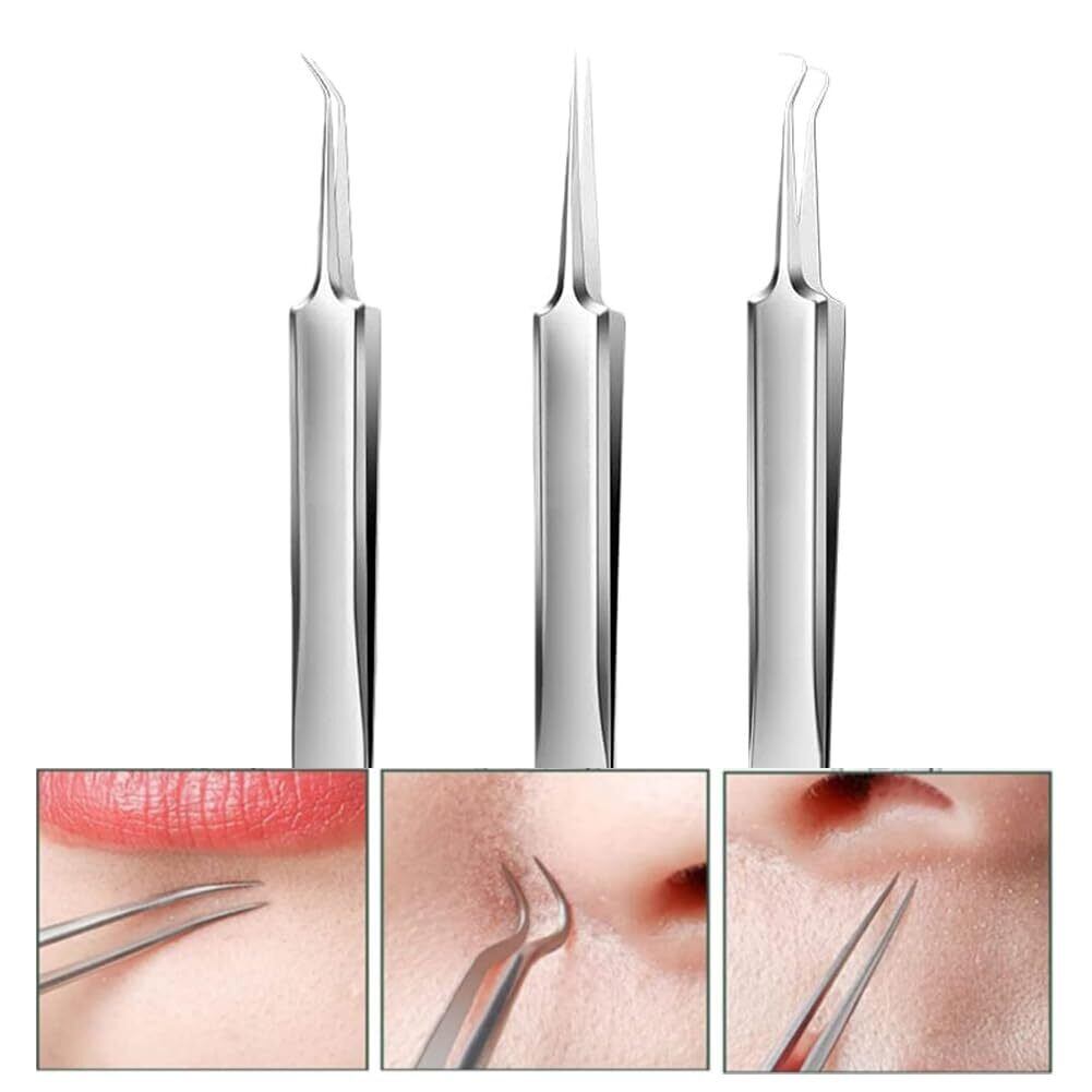 ブラックヘッドピンセット: さまざまなニーズを満たすために、ストレートピンセット、角度付きピンセット、湾曲したピンセットの 3 つの異なる形状の黒ずみ除去ツールが含まれています。