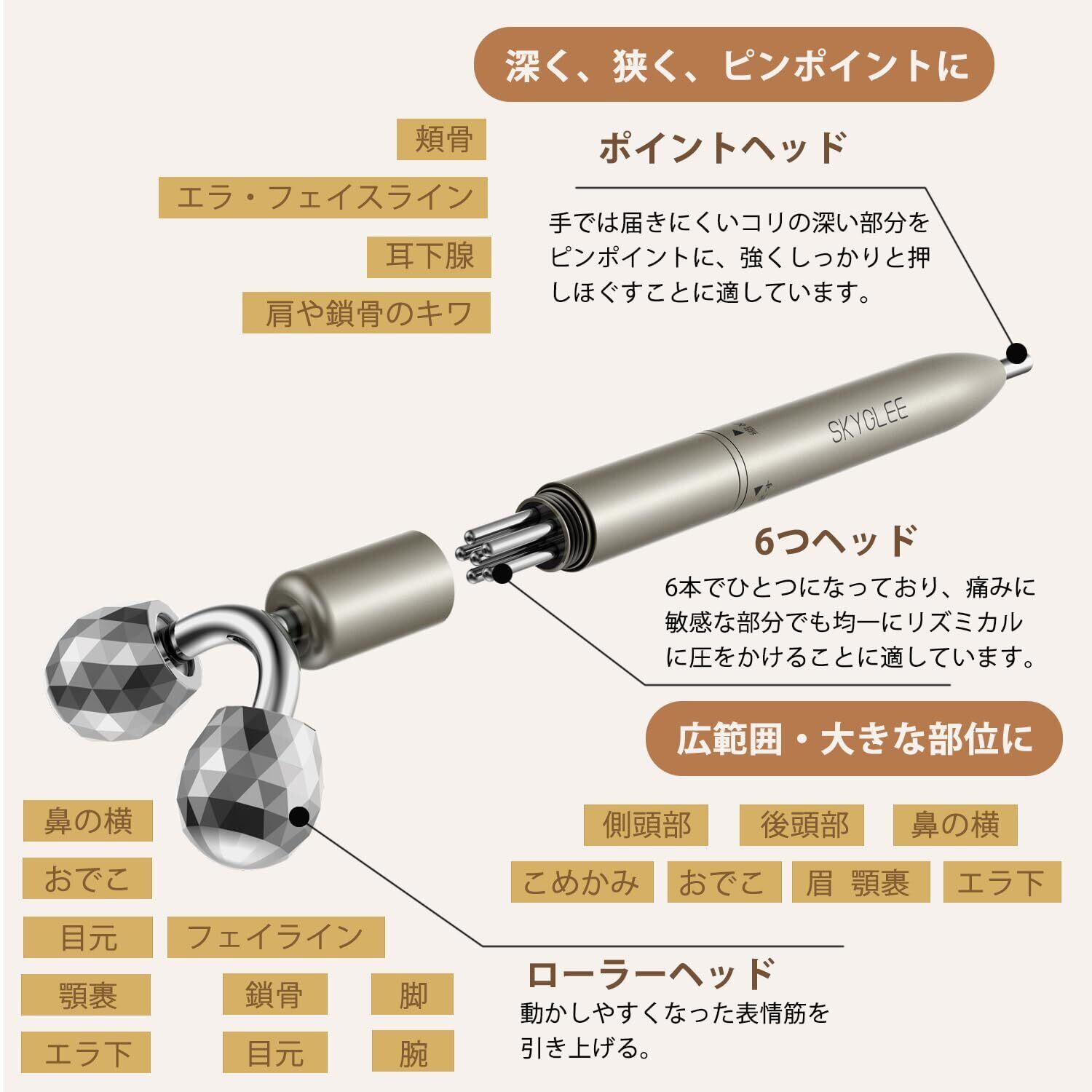 【3WAYヘッド設計】近年において健康及び美容への意識が高まり、数多くの健康機器及び美容機器が開発されている。中でも、指圧刺激によるツボ押し棒やローラー美顔器は、その手軽に行えることから人気が高い。しかし、両方の機能を兼ね備えた機器は少ないのが現状です。そこで、指圧とローラーリフトを融合させた美容機器を利用した美顔器が開示されている。