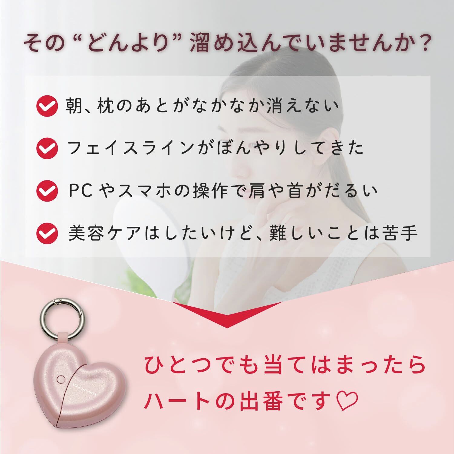 【1台2役の欲張りハート】流してケアする「かっさ」と押してケアする「Wポインター」が1つに組み合わさった、チャーム型美顔器!いつでもどこでも、かわいくケアできちゃいます。