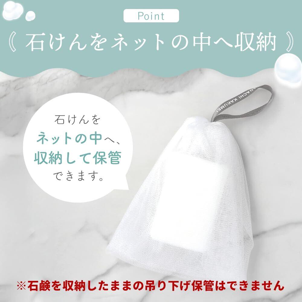 【泡立て専用ネット/注意事項】 石鹸が入るサイズですが、落下防止用のゴムは付属していません。石鹸を入れたまま吊るす用途には対応しておらず、泡立て専用としてご使用ください。