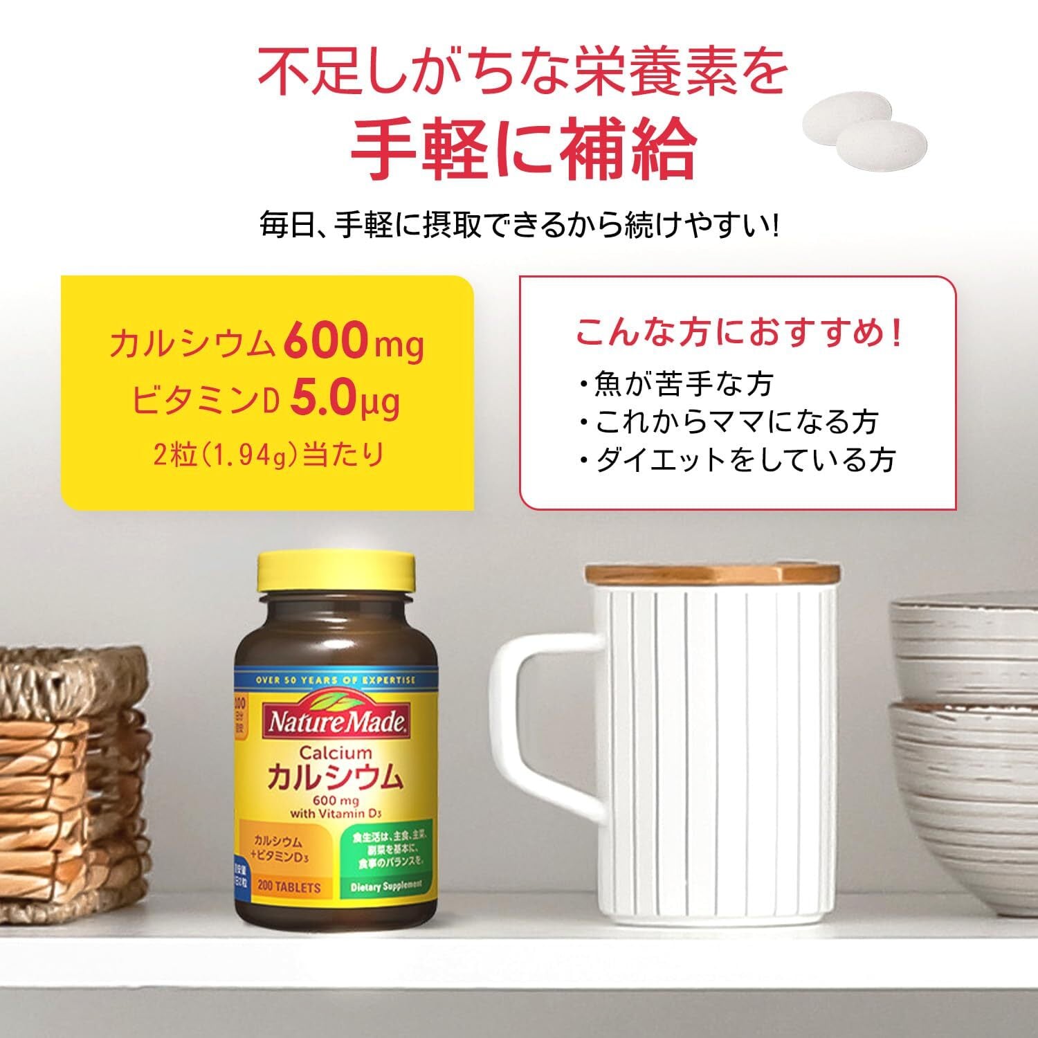 栄養成分 : 1粒(0.97g)当たり エネルギー/0.76kcal、タンパク質/0〜0.1g、脂質/0〜0.1g、炭水化物/0.181g、 ナトリウム/0〜10mg、カルシウム/300mg、ビタミンD/2.5μg