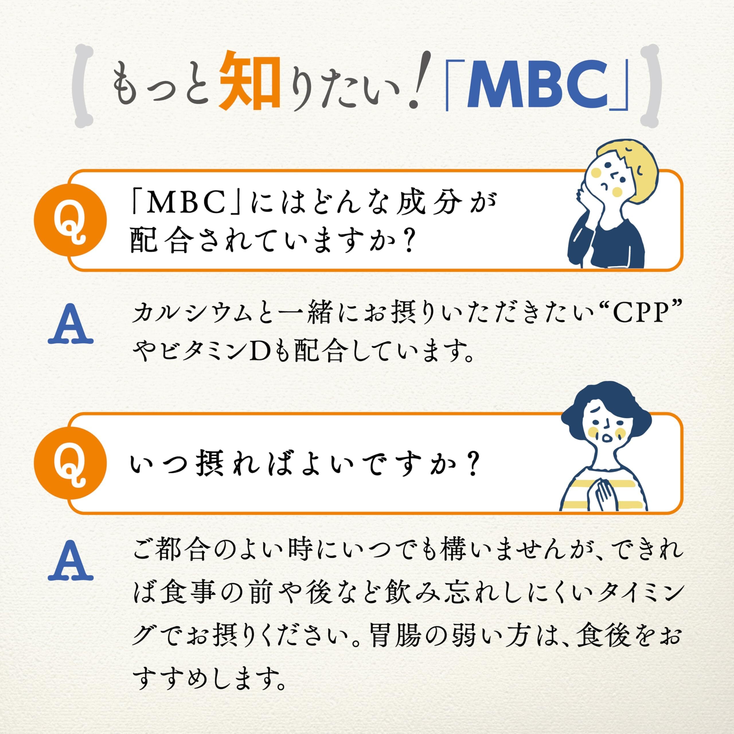【MBCの特徴】 MBCは牛乳にわずかしか含まれない希少な成分由来のCPP(カゼインホスホペプチド)をメイン成分に採用し、さらにカルシウムと一緒に補いたいビタミンDも加えた保健機能食品です。