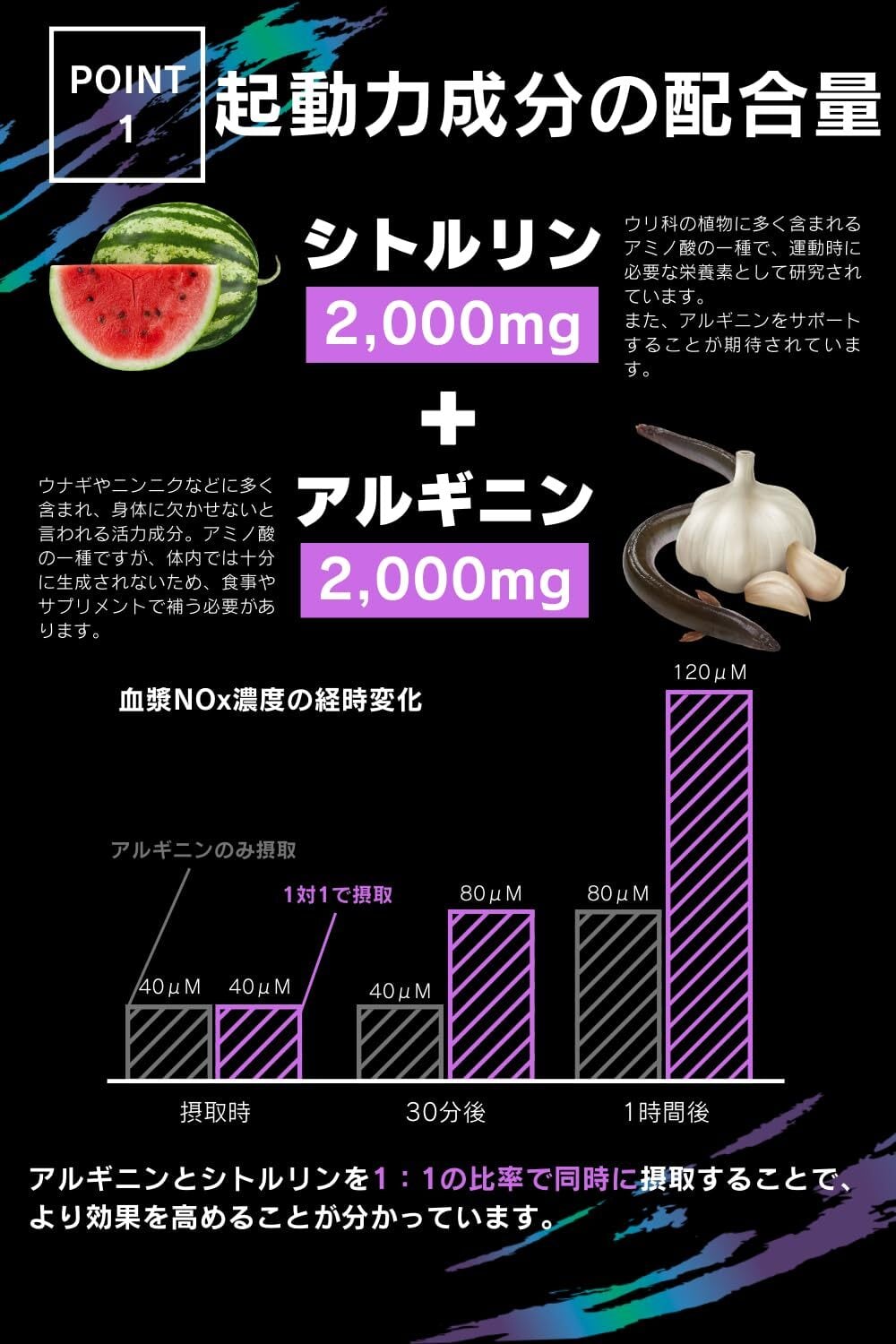 【業界屈指の配合量】 「シトルリン」「アルギニン」を各2,000mg配合。「シトルリン」はウリ科の植物に多く含まれるアミノ酸で、運動時に必要な栄養素です。「アルギニン」はウナギやニンニクなどに多く含まれ、身体に欠かせないと言われる成分。「シトルリン」と「アルギニン」を同時に1:1の比率で摂取することで、より効率的に効果を高めることが出来ます。