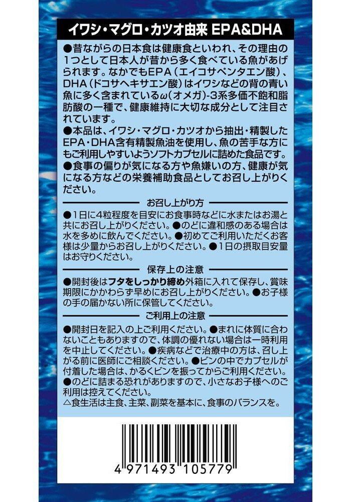食事の偏りが気になる方、魚嫌いの方! 1)4粒でイワシ・マグロ・カツオ由来のフィッシュオイル約1.2gが摂取出来ます。 2)EPA186mg・DHA124mg含有(4粒中) 4粒でイワシ1切れ分のEPA・DHAが摂取出来ます。 ※まいわし1匹50gを3枚下ろしにした場合(五訂日本食品成分表より) 3)魚ぎらいの方にも召し上がりやすいソフトカプセル 4)お得な1.5ヶ月分 本品は、EPA・DHAを含むイワシ・マグロ・カツオ由来の魚油を魚の苦手な方でもご利用しやすいソフトカプセルに詰めた食品です。食事の偏りが気になる方や魚嫌いの方、健康維持の気になる方などの栄養補助食品としてお召し上がりください。