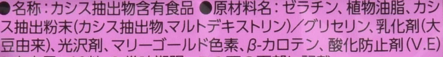 ゼラチン、植物油脂、カシス抽出粉末(カシス抽出物、マルトデキストリン)/グリセリン、乳化剤(大豆由来)、光沢剤、マリーゴールド色素、β-カロテン、酸化防止剤(V.E)