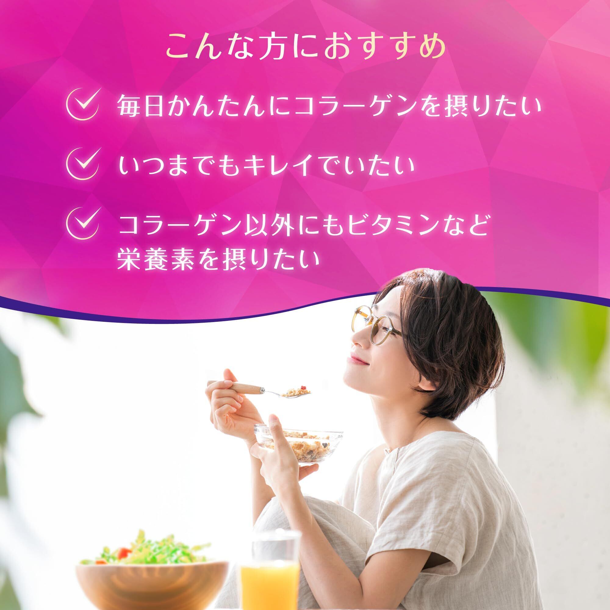 豚コラーゲンペプチド(ゼラチンを含む)(国内製造)、デキストリン、難消化性デキストリン、レモンバームエキス末、殺菌乳酸菌粉末、食用油脂、バラ抽出物末、コエンザイムQ10、豚エラスチンペプチド/V.C、ヒアルロン酸、乳化剤、グルコサミン(えび・かに由来)、香料、V.B1、V.B6、甘味料(アセスルファムK、スクラロース)、V.B12