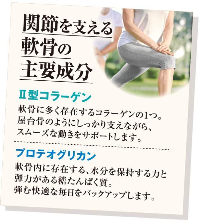 II型コラーゲンやプロテオグリカン、ヒアルロン酸などは、身体を構成する土台として、重量な役割を果たしています。『II型コラーゲン+プロテオグリカン』は、年齢とともに深くなる“ふしぶし”のお悩みに、2成分でしっかりアプローチ。さらに、体作りに役立つCBPのほか、コンドロイチン硫酸、N-アセチルグルコサミンも配合し、いつまでもスムーズな毎日を送り続けたいという思いを支えます。 ●コラーゲンの中でも鶏軟骨に多く存在「II型コラーゲン」 約20種類あるコラーゲンの中でも、鶏軟骨に多く存在するのがII型コラーゲンです。『II型コラーゲン+プロテオグリカン』は、鶏軟骨由来の厳選したII型コラーゲンを使用しています。 ●サケ鼻軟骨由来の弾力性に「プロテオグリカン」 プロテオグリカンはたんぱく質とグリコサミノグリカン(その多くはコンドロイチン硫酸)というムコ多糖類が結びついたもの。水分を保持する特長があり、サケ鼻軟骨にも多く含まれます。弾むスムーズな毎日をサポートする成分です。 ※水またはぬるま湯で噛まずにそのままお召し上がりください。