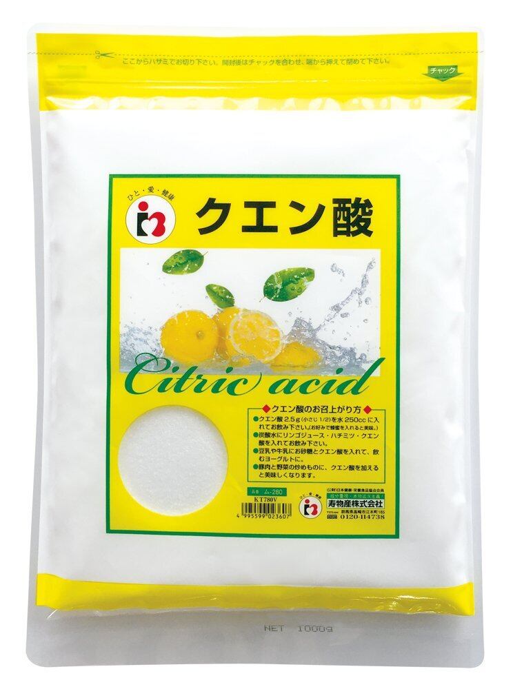 無色透明の結晶粉末で純度99.5%以上という高純度の無水クエン酸です。 クエン酸2.5g(小さじ1/2)を水250ccに入れてお飲みください。 炭酸水にリンゴジュース・はちみつ・クエン酸を入れてお飲みください。 豆乳や牛乳にお砂糖とクエン酸を入れて、飲むヨーグルトに。 豚肉と野菜の炒めものに、クエン酸を加えると美味しくなります。