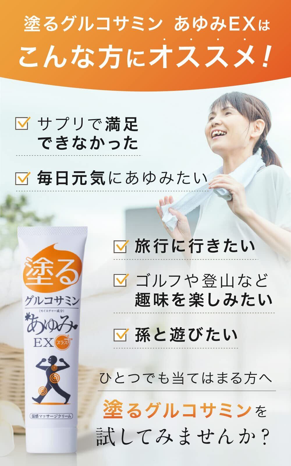 あゆみEXとは:ひざ・腰・肩などにマッサージしながら塗りこむタイプのグルコサミンです。人気の秘密は「グルコサミン」「プロテオグリカン」「コンドロイチン」「ヒアルロン酸」「コラーゲン」などのなめらか成分に加え、温感成分を配合でぽかぽかを即実感できること。チューブタイプなので、持ち運びしやすく衛生的と好評です。においもほとんどなく、周りに気をつかう必要がありません。湿布薬が使用できない方でもご使用いただけます。