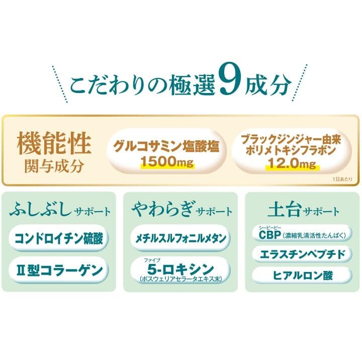 メチルスルフォニルメタン(台湾製造)、乳糖、ブラックジンジャーエキス末、サメ軟骨エキス末(コンドロイチン硫酸含有)、ボスウェリアセラータエキス末、鶏軟骨エキス末(II型コラーゲン、コンドロイチン硫酸含有)(鶏肉を含む)、濃縮乳清活性たんぱく、エラスチンペプチド/グルコサミン(えび・かに由来)、セルロース、グリセリン脂肪酸エステル、シクロデキストリン、微粒二酸化ケイ素、CMC-Ca、ステアリン酸Ca、セラック、ヒアルロン酸 ※リニューアルに伴い、内容等予告なく変更する場合がございます。予めご了承ください。