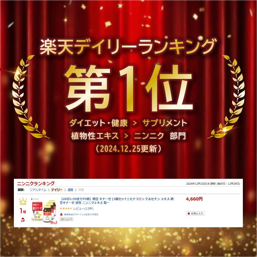 【2022年モンドセレクション金賞受賞】納豆キナーゼ4000FUは日本の業界TOPクラスの配合です。お客さまの要望に応え、従来商品の2倍まで高めました。この量は糸引き納豆の2パック分に相当します。