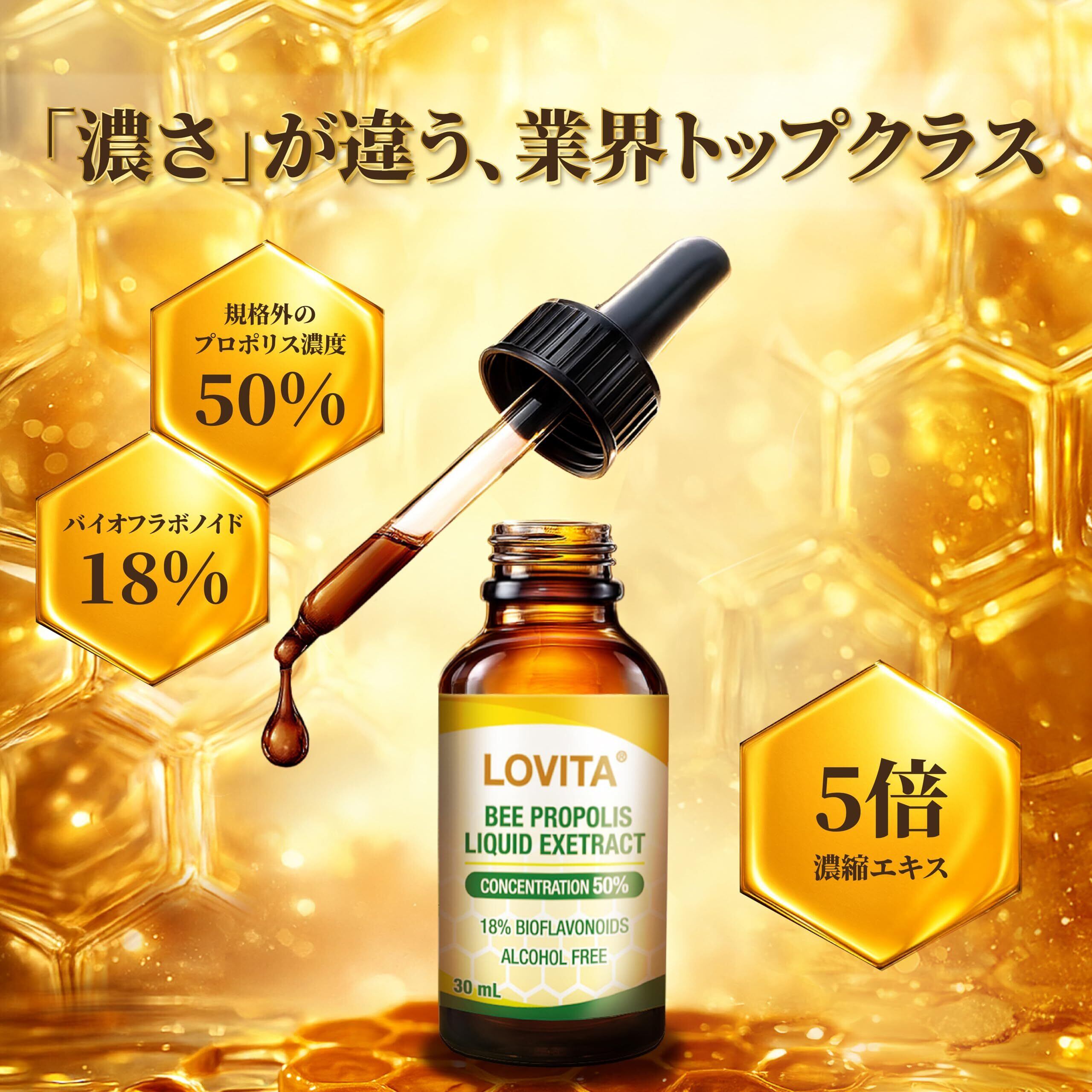 LOVITA プロポリスリキッド 高濃度 エキス50% (500mg/ml) | アルコールフリー 飲みやすい | カナダ産 (30ml) パッケージ変更中