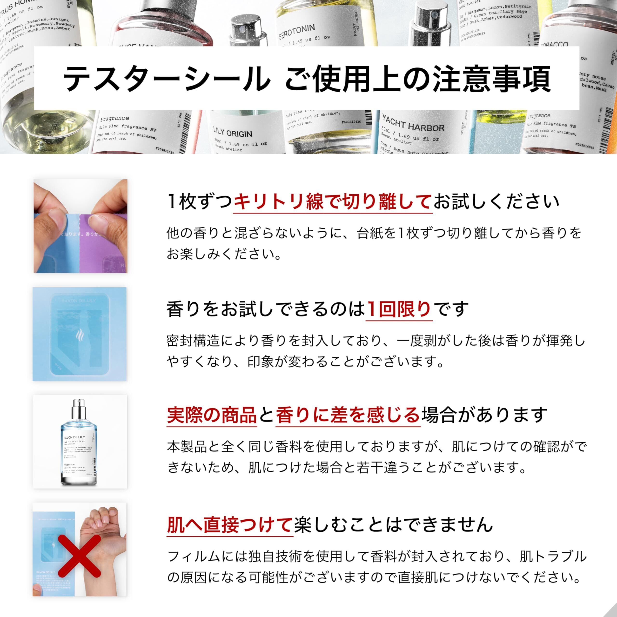 【使用上の注意】本品は香り見本としてご使用ください。香料が直接肌に触れることで、まれに肌トラブルを引き起こす場合がございます。安全のため、肌への直接使用はお控えください。
