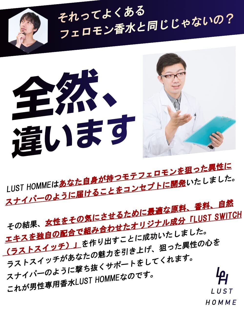 【香りはムスクを主体にした上品な香り】では、なぜモテるのか? 彼らは目には見えないモテフェロモンを振りまいているからなんです。 そこでLUST HOMMEが開発されました。