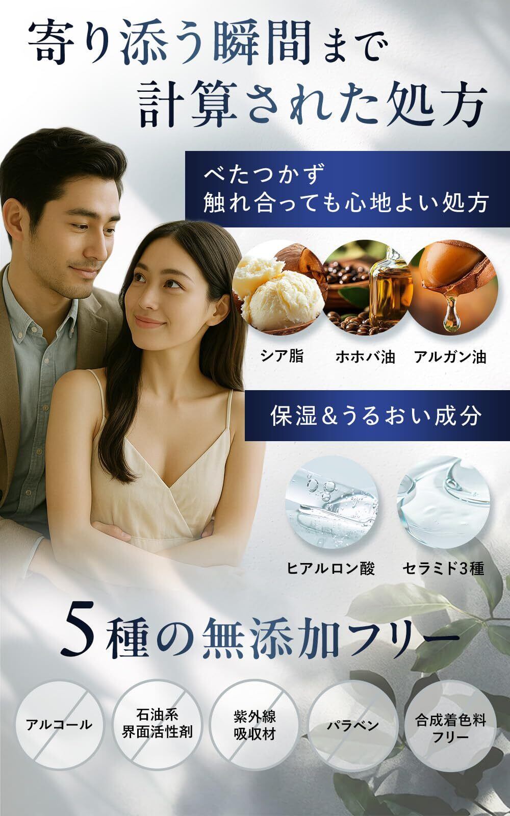 【寄り添う瞬間まで計算された処方】シア脂・ホホバ油・アルガン油・ヒアルロン酸・セラミド3種を配合。 香りをまとうだけでなく、肌をうるおいで包み込み、触れ合う瞬間も心地よく演出します。