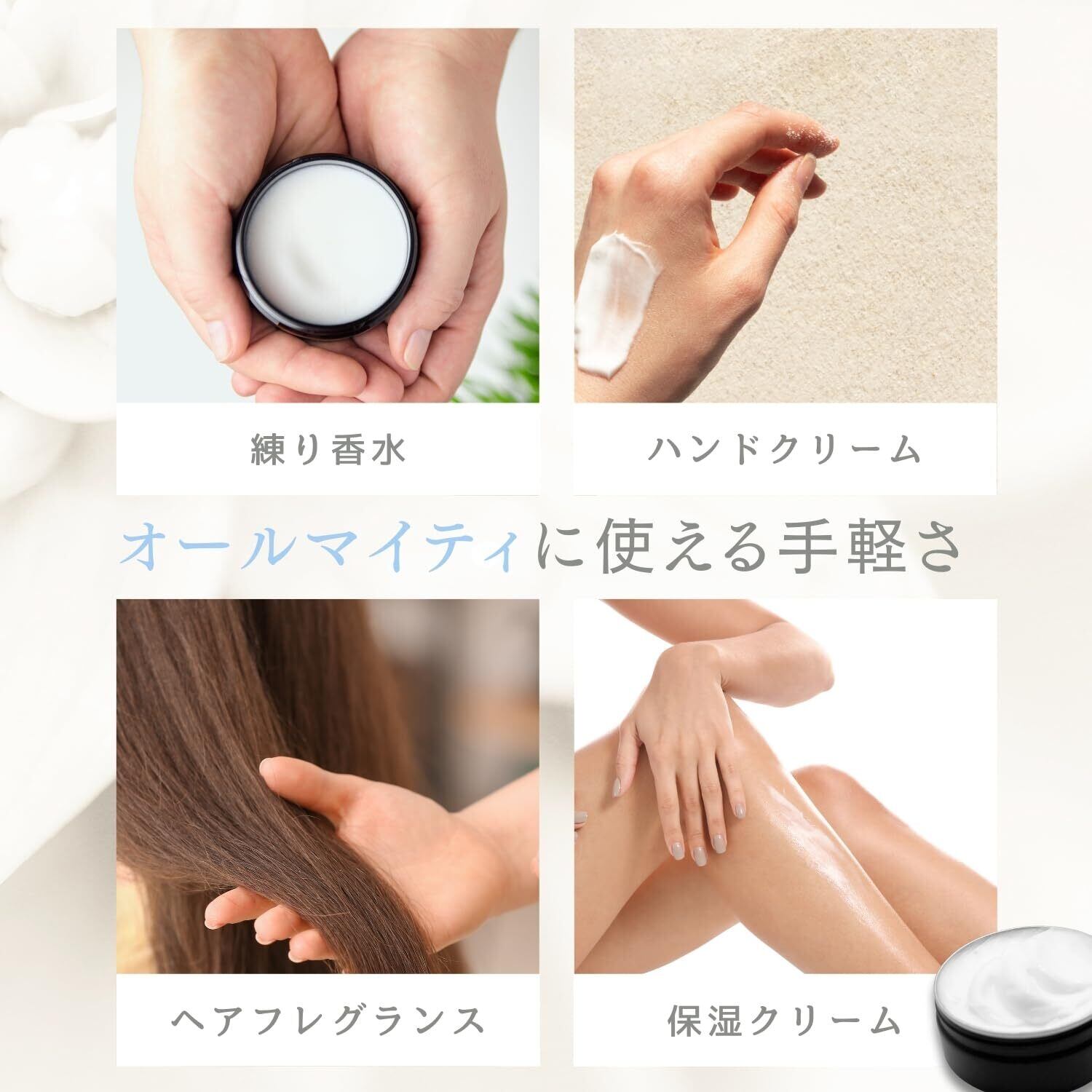 【扱いやすいクリームタイプ】クリームタイプなので、伸びが良く、塗りやすい!保湿クリーム・ヘアフレグランス・ハンドクリームとしても活躍!