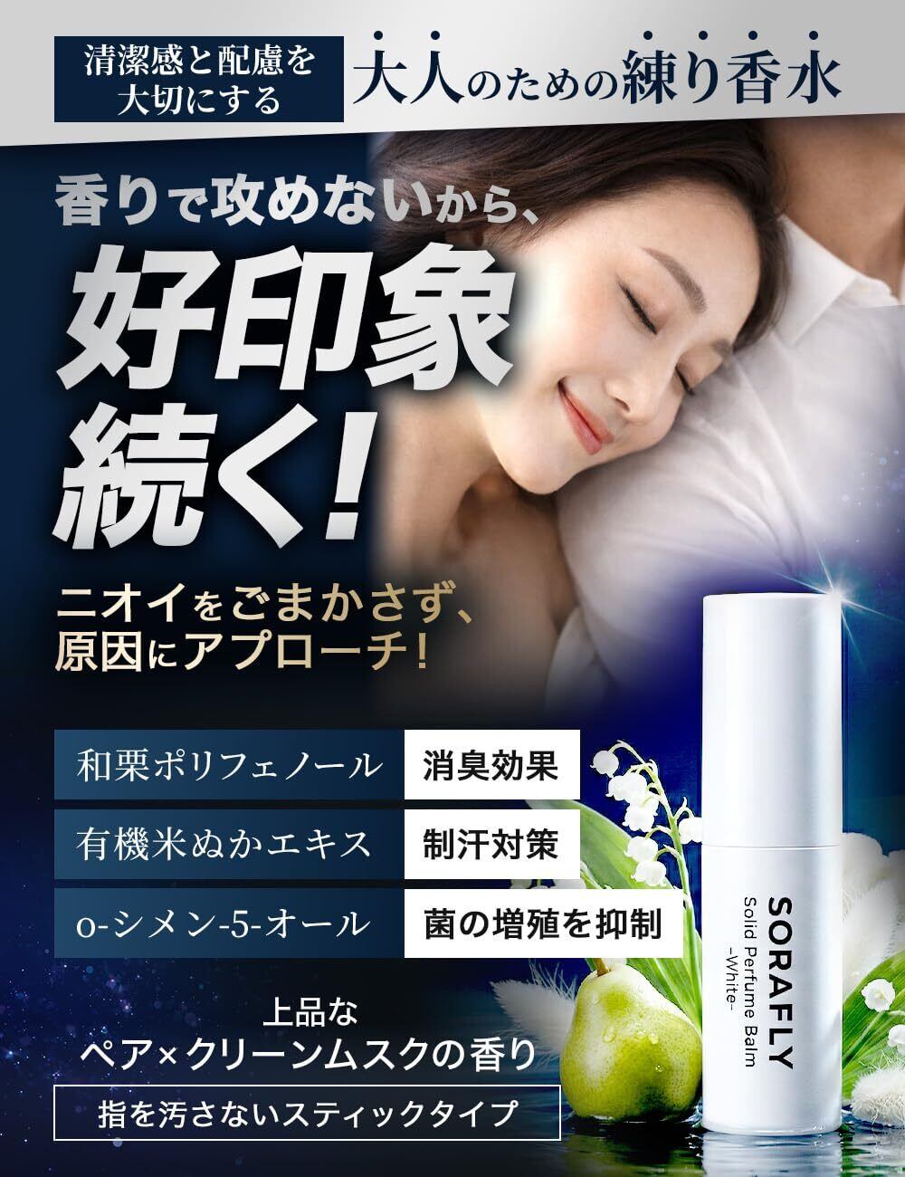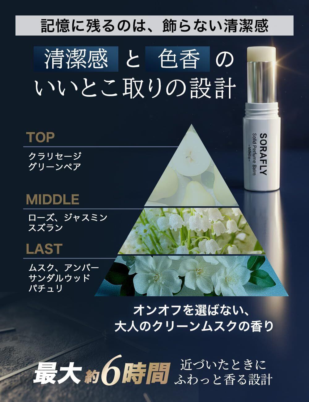 【清潔感と色気を両立するクリーンムスクの香り】トップはグリーンペアの爽やかさ、ミドルはフローラルのやさしさ、ラストはムスクとアンバーの落ち着きへ。クリーンムスクを基調とした香りが、清潔感と大人の余裕をバランスよく引き立てます。