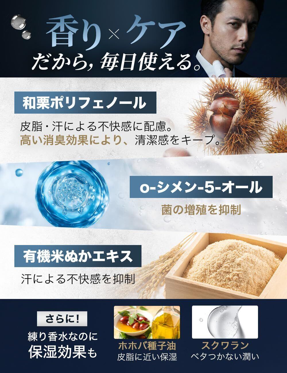 【ニオイ悩みに配慮した機能性設計】和栗由来成分(和栗ポリフェノール)や o-シメン-5-オール、有機米ぬかエキスを配合。さらに、とうもろこし由来のデキストリンパウダーを採用し、汗や皮脂による不快感に配慮した処方です。香りで強く覆うのではなく、清潔感を大切にしたい方に。