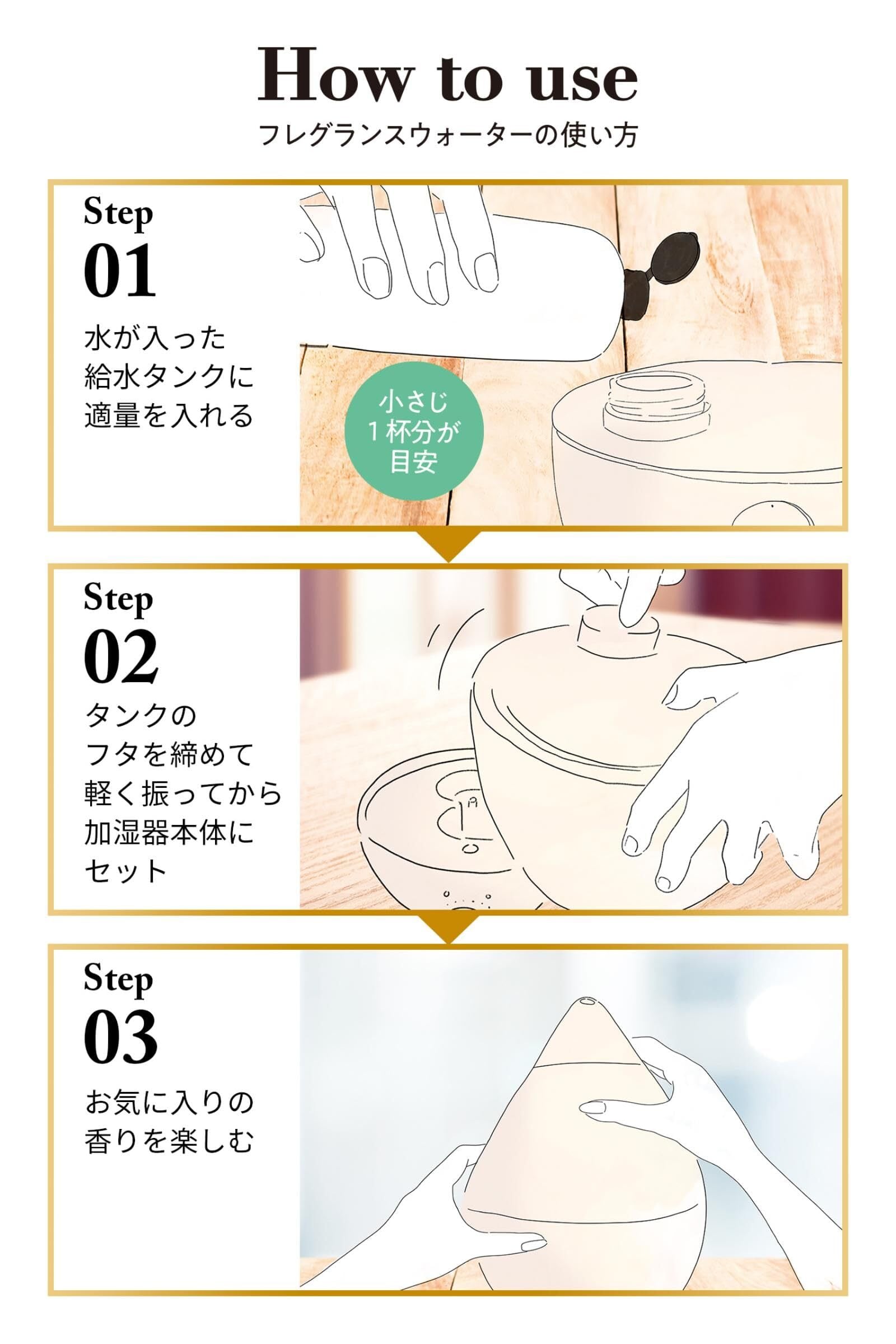 加湿器用のフレグランスウォーター。給水タンクに水道水と一緒に入れるだけ。ふわっと広がる心地よい香りを楽しめます。