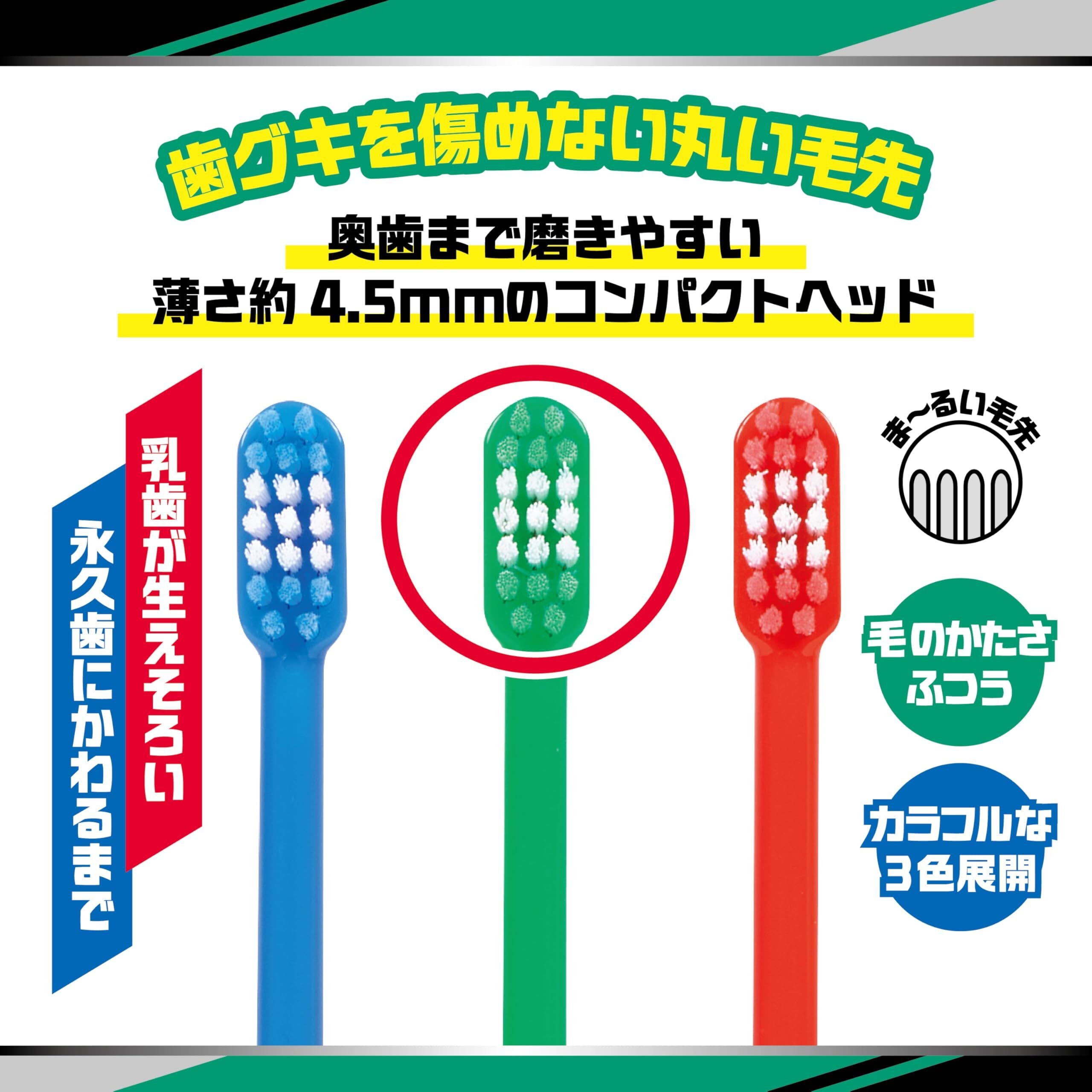 歯グキを傷めにくい丸い毛先と、奥歯まで磨きやすい先の丸いコンパクトヘッドでお子様でも使いやすいハブラシです。