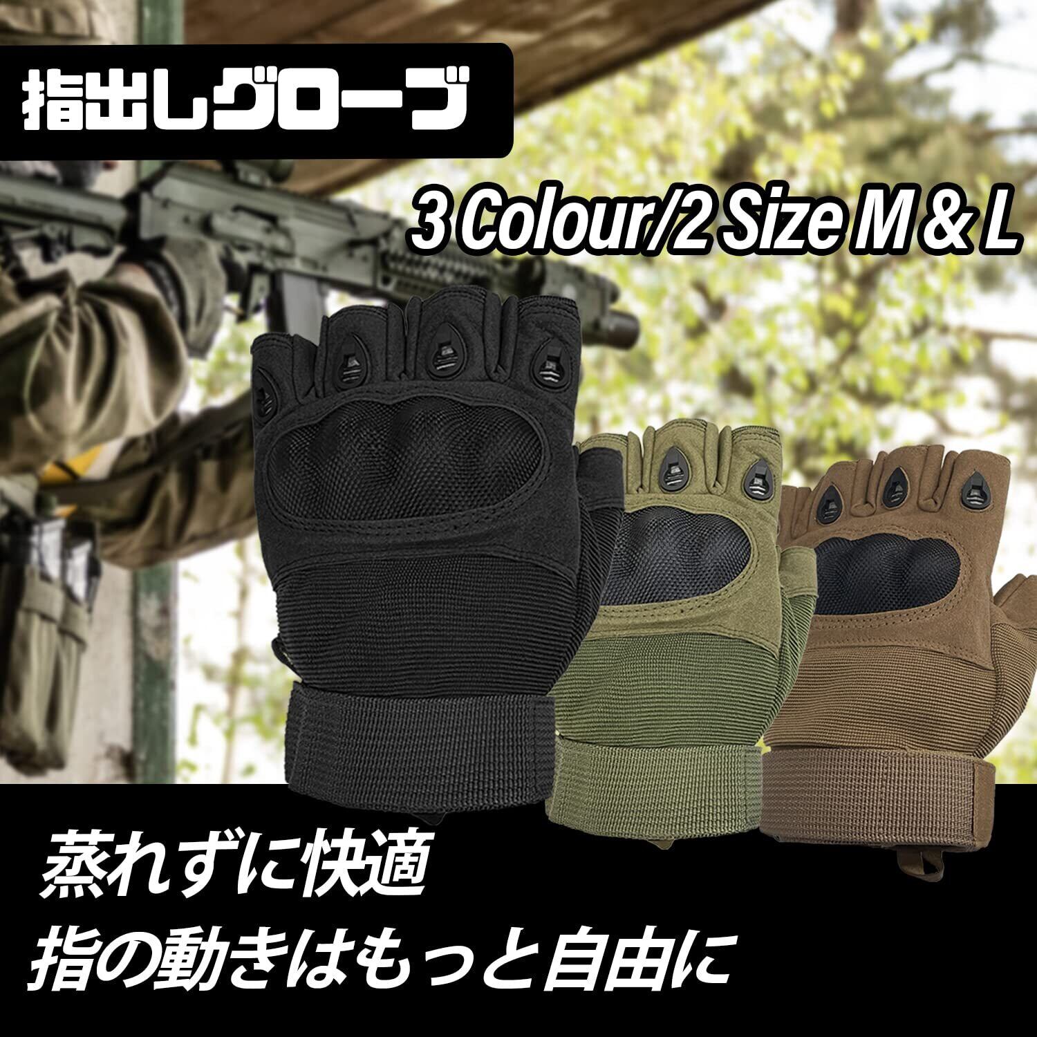 【指出しグローブ】サバゲで指先が露出しているハーフフィンガーです。素手感が好きな方必見!スマホに対応できるタイプ。指の動きはもっと自由に!通気性抜群、蒸れずに快適、暑い夏で大活躍しています。ブラック&アーミーグリーン&ブラウン3色、M/L2サイズを用意しております。