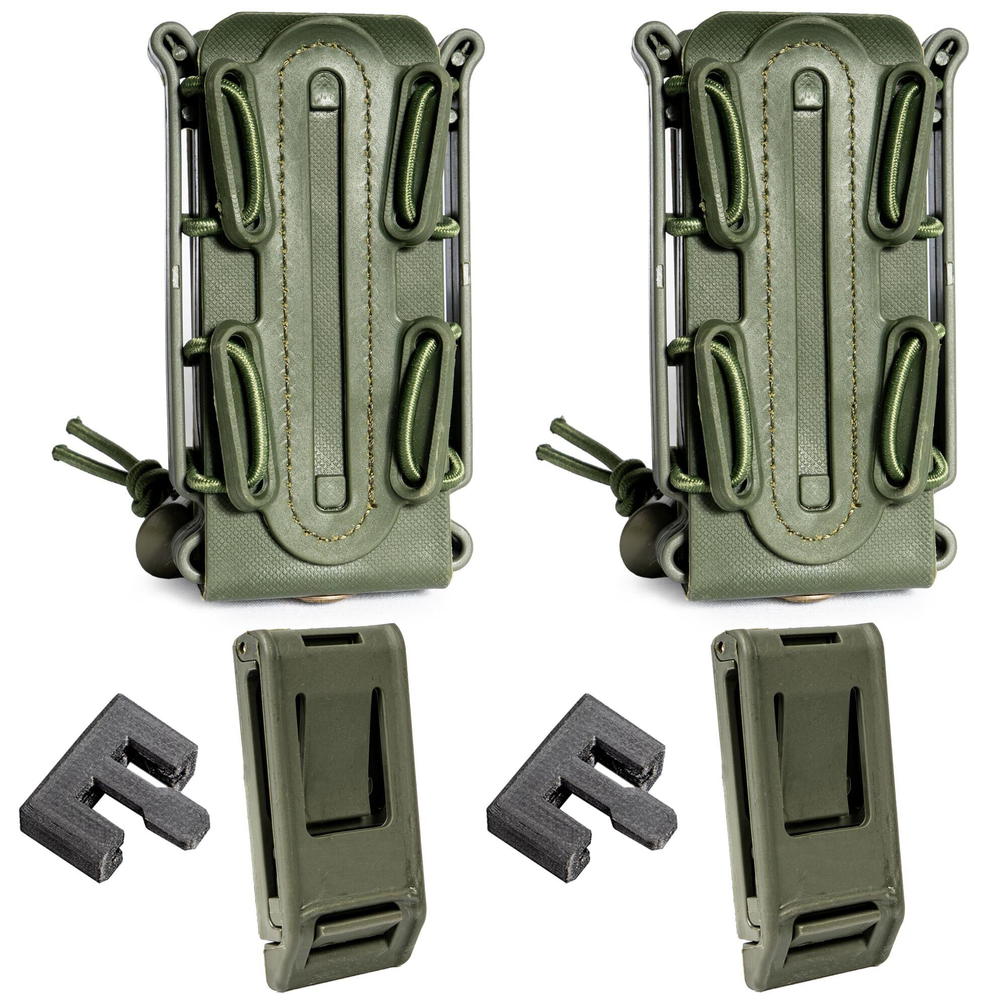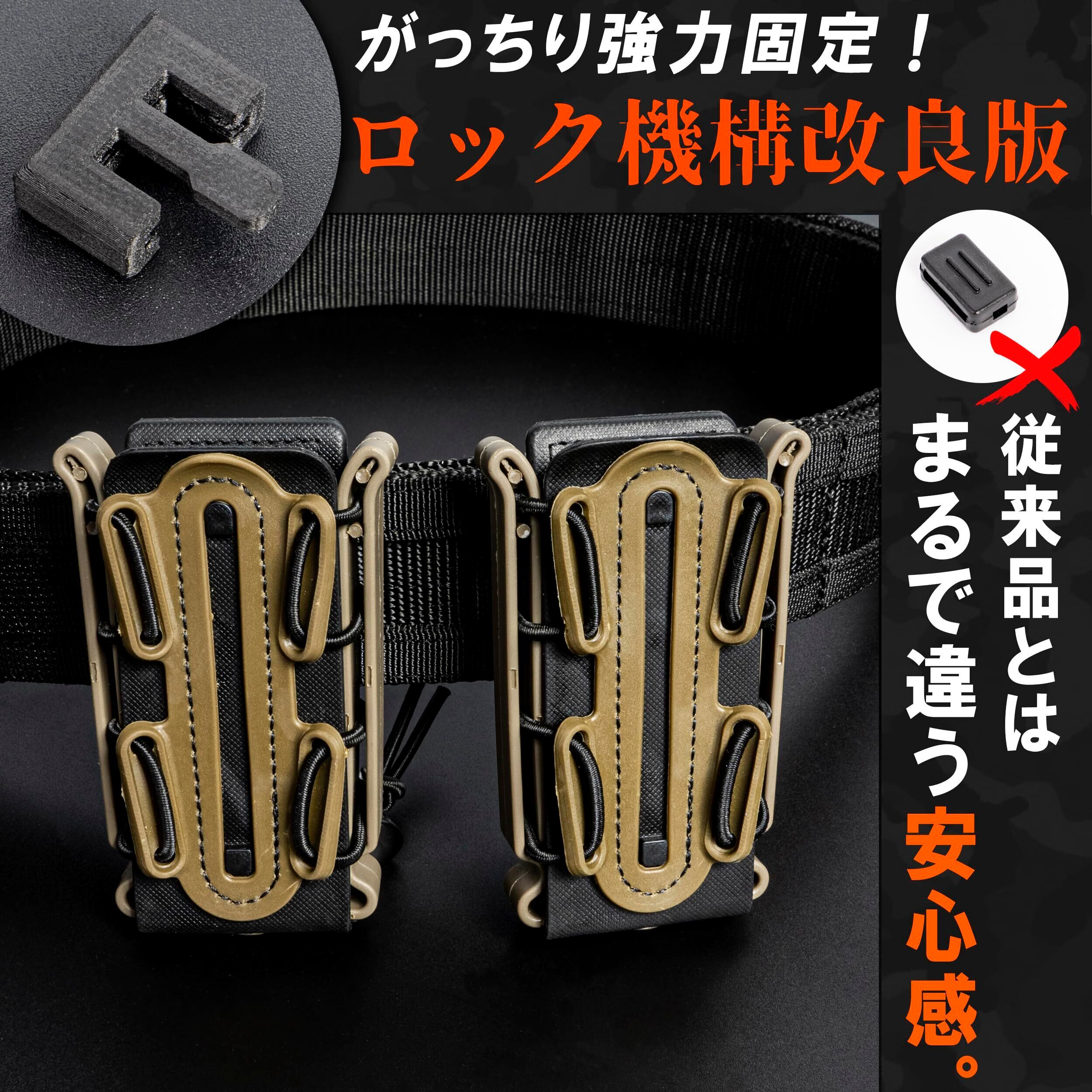ソフトシェルタイプのハンドガン用マガジンポーチ。2個セットです。ゴムバンドとソフトシェルにより、グロックやデーザートイーグル、MP7、MP5など多種類のマガジン形状に対応可能です。 留具はオリジナルのデザインにより、ロックの保持力を改善いたしました。 激しい運動でも留具が勝手に外れることが無くなり、ゲームに集中できます。