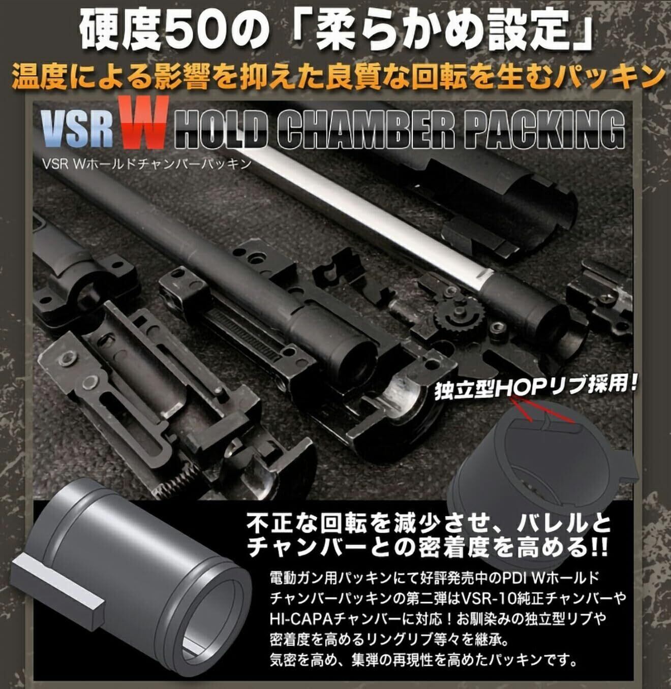 《商品説明》 不正な回転を減少させ、バレルとチャンバーとの密着度を高める!! 電動ガン用パッキンにて好評販売中のPDIホールドチャンバーパッキンの第二弾はVSR-10純正チャンバーやHI-CAPAチャンバーに対応!おなじみの独立型リブや密着度を高めるリングリブ等々を継承。気密を高め、収弾の再現性を高めたパッキンです。 ※電動ハンドガン及びコンパクトマシンガンシリーズには対応しません。 ※組込みに関しては、チャンバーをはじめ各種パーツの芯出しを行って下さい。また、グリス等を用いたメンテナンスの頻度を高めて下さい。 気密性を高める為にチャンバーパッキンはタイトに設計されています。 《スペック》 対応機種 ・東京マルイ製エアソフトガンなど 材質:二トリルゴム(硬度50)
