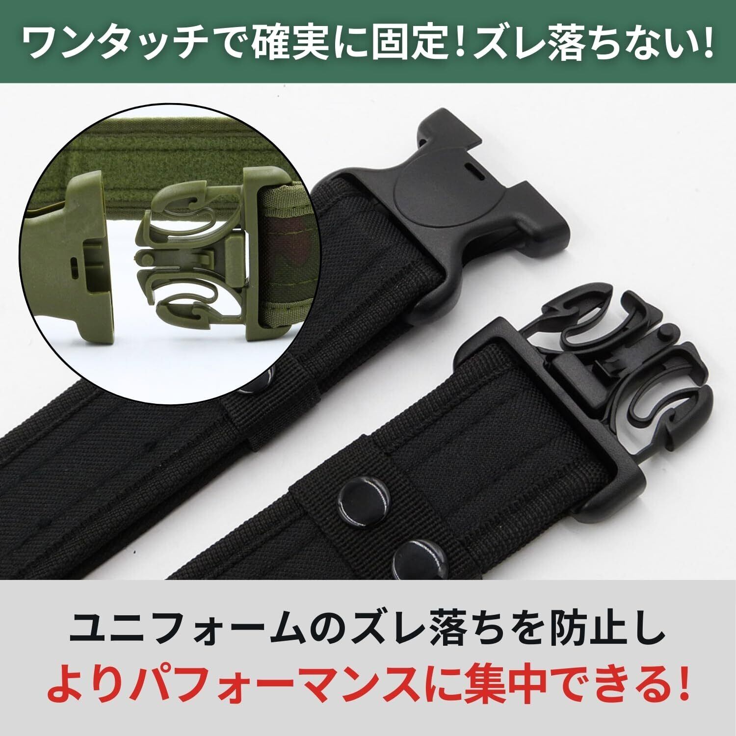 【ワンタッチで簡単着脱!】 サバゲー中の激しい動きでもしっかりとホールドします。着脱がスムーズで、特に装備が多い状況でも手間なく使用できます。パンツのベルトループが広い場合は、そのままベルトを外せるため、迅速な脱着が可能です。 【カスタマイズの自由度抜群】 このタクティカルガンベルトは、レッグホルスターやマガジンポーチなど、さまざまなアイテムと互換性があります。自分好みにカスタマイズして、より快適な装備を作り上げることができます。ベルト幅は3.8cmなので、対応するアイテムを簡単に取り付けることができます。