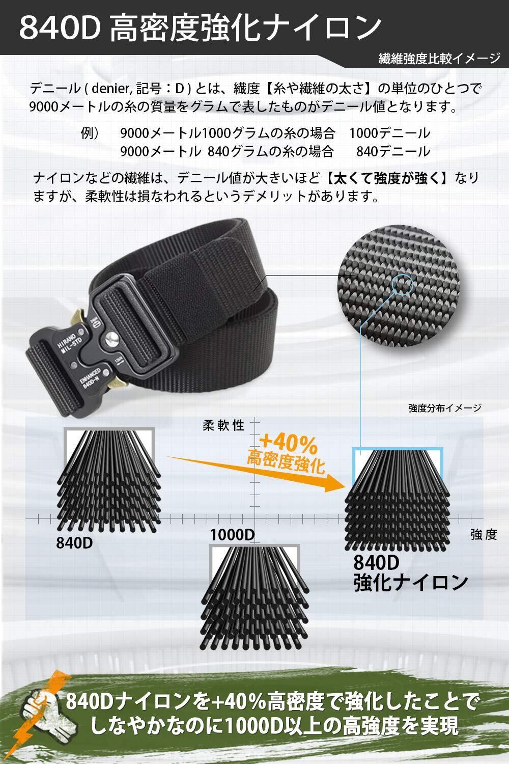 【超強化型タクティカルベルト】とは、840D(デニール)高品質ナイロンを通常より+40%の高密度で繊織することで、米軍基準の1000D以上の強度と柔軟性を実現した強化タクティカルベルトです。