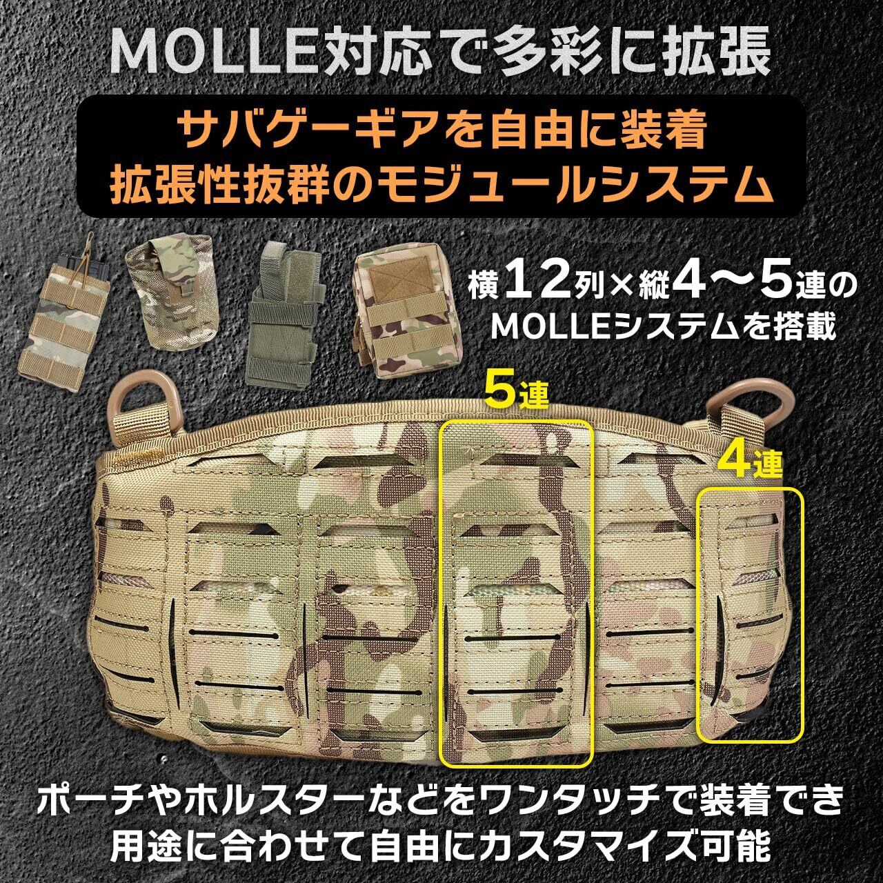【 MOLLEシステム対応】 本タクティカルベルトはMOLLEシステムに完全対応しており、マガジンポーチやホルスター、アクセサリーを自在に取り付け可能。サバゲーやミリタリー装備の拡張性が高く、戦況やスタイルに合わせたカスタマイズが楽しめます。プレートキャリアやチェストリグとの相性も抜群で、サバゲー初心者から上級者まで幅広く活用できる汎用性の高いモールベルトです。