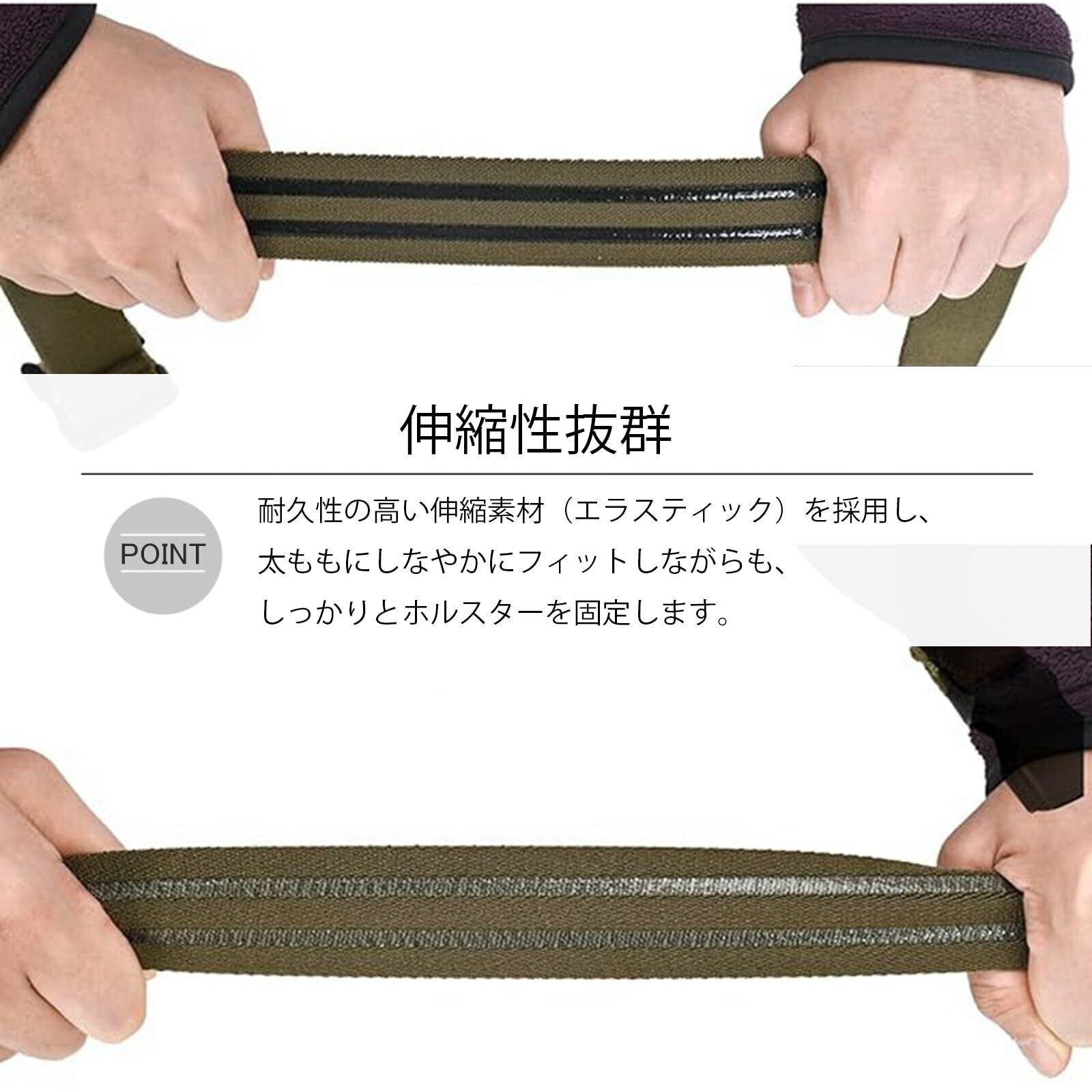 圧倒的なフィット感と安定性! 本製品は、耐久性の高い伸縮素材(エラスティック)を採用し、太ももにしなやかにフィットしながらも、しっかりとホルスターを固定します。画像のように、引っ張ると伸びる設計で、締め付けすぎずに確実なホールド感を実現。滑り止め用のシリコンやラバー素材を内側に織り込んでいるため、激しい運動や汗をかいてもバンドが回転したり、ズレ落ちることを防ぎ、ホルスターを常に最適な位置にキープします。
