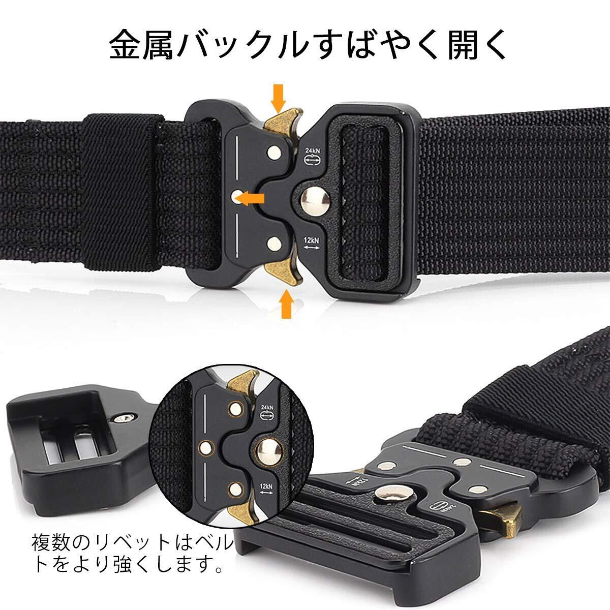 【クイックリリースバックル】タクティカルベルトバックルは亜鉛合金製で、従来のプラスチックバックルよりも傷がつきにくく、防錆性があり安全です。 1秒のクイックリリース機能、便利なバックル開閉、スムーズな開閉。 3つのリベットがベルトをよりしっかりと信頼性の高いものにします。ベルトを締めると滑ることはありません。
