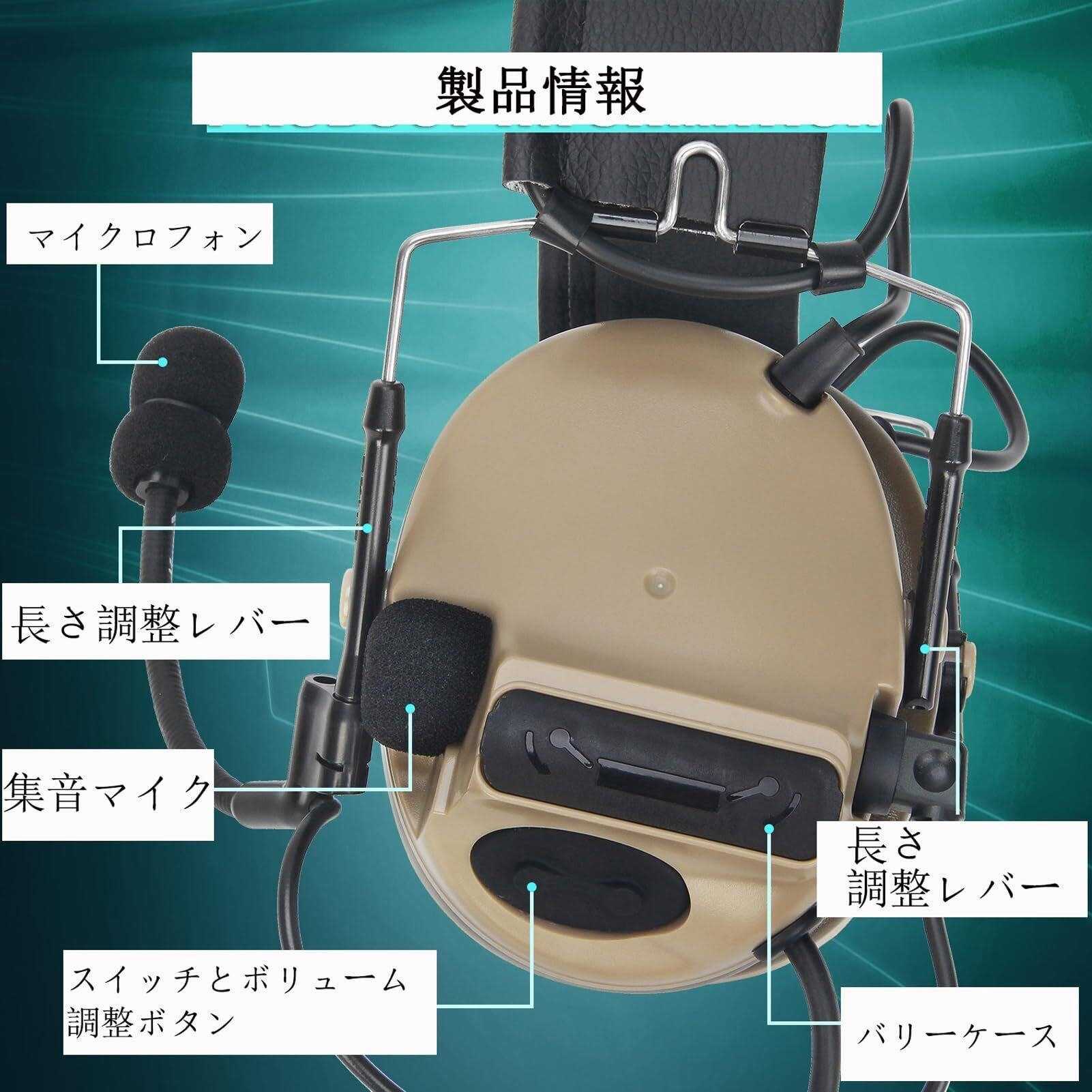 2.ピックアップマイク(左右任意変換用途)。3.オリジナルイヤーカップ:外装材料TPU+内に100%高密度スポンジ+下地ABSを充填し、耐久性のあるスポンジイヤーカップは、使用時間が長く、より耐久性がある。4.よりコンパクトで携帯性が高い(バッテリセル2*AAA)(付属しません)。