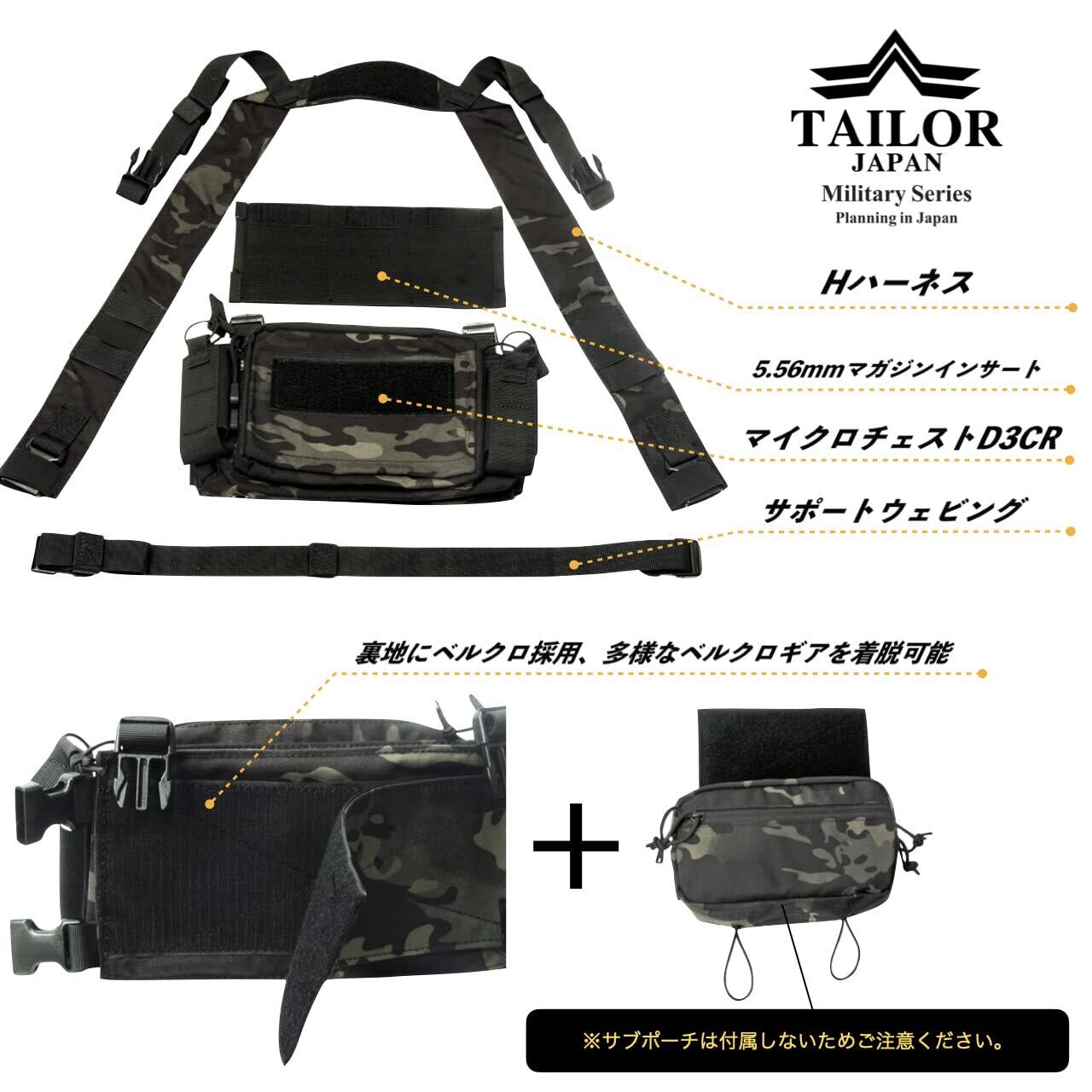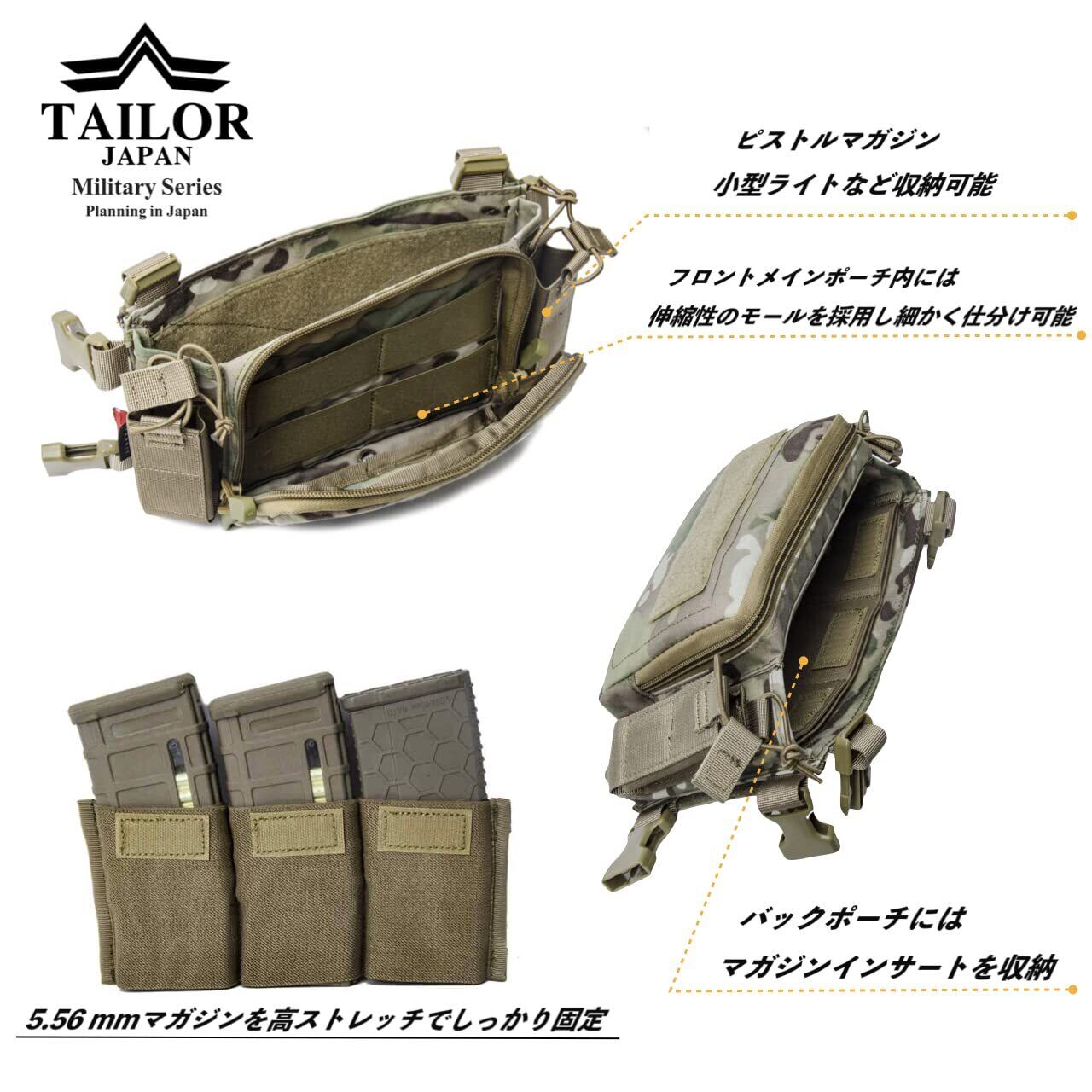 【厳選素材】:軽量・高耐久のコーデュラ500D強化ナイロン製の強化改良モデル。ナイロン素材を軍仕様のコーデュラ500Dに改良しさらに耐久性および機能性を上げだけ改良モデル。