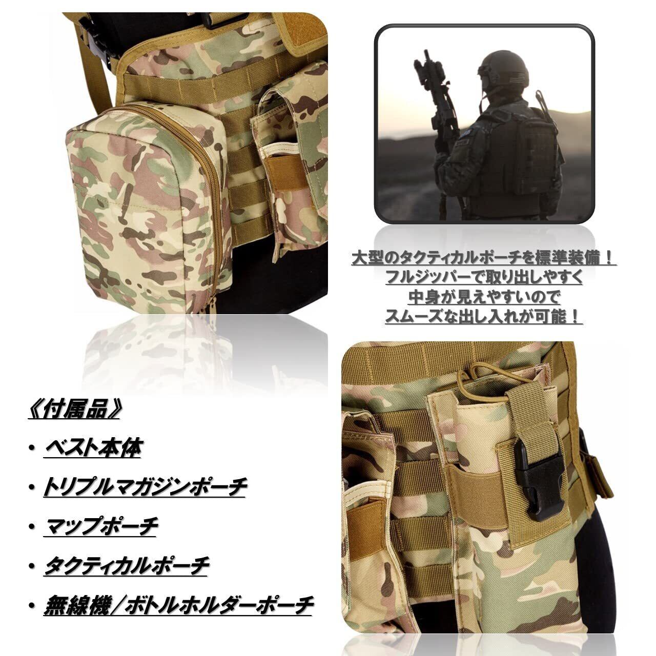 【標準装備品】 3連マガジンポーチ・アドミンポーチ・タクティカルポーチ・ボトルホルダーorダミー無線機ポーチ(全て取り外し可能)