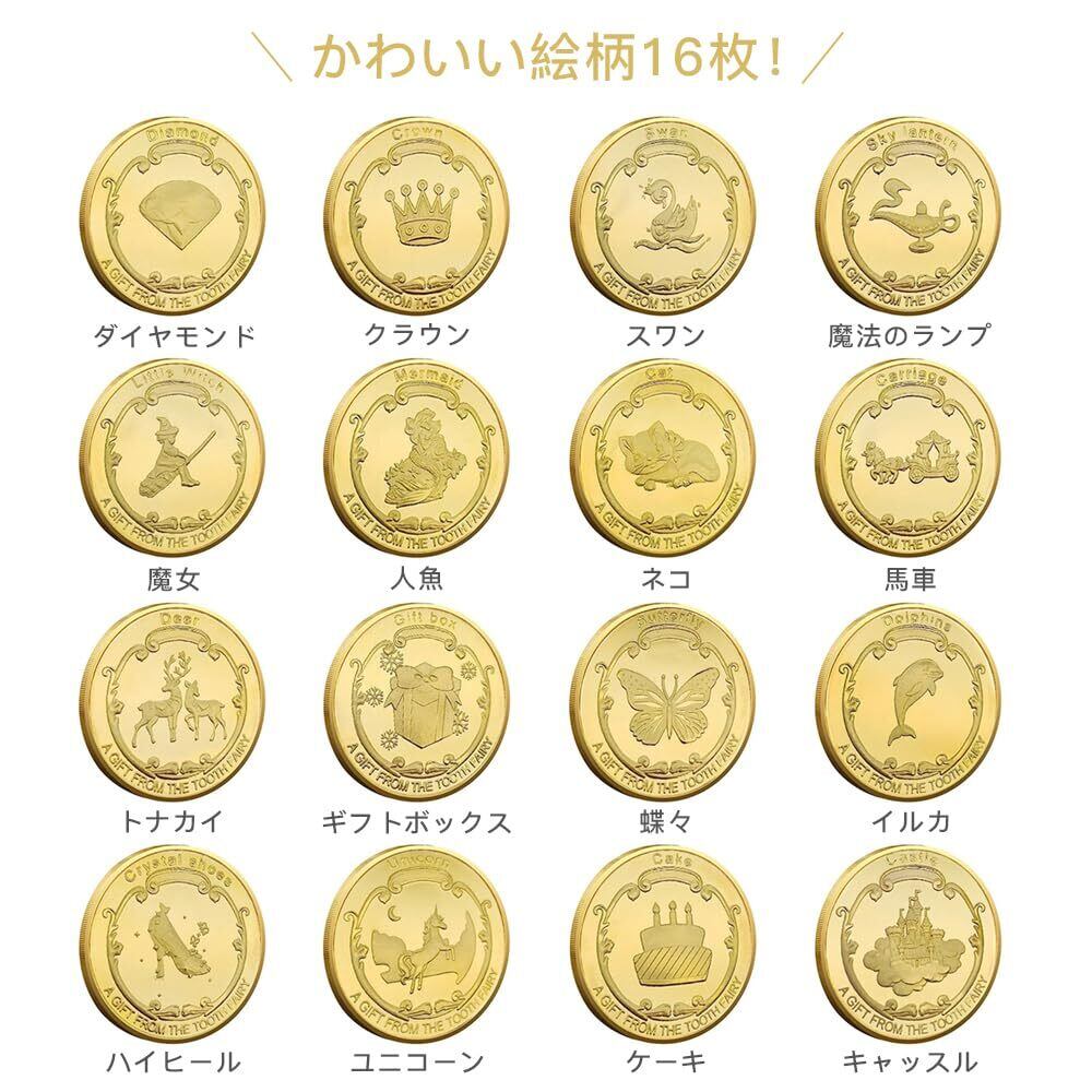 歯の妖精コイン 16枚セット 歯の妖精 乳歯 コイン 金貨 生え変わり 記念コイン 歯と交換するコイン コインケース付 こども 遊び道具 ゴールド