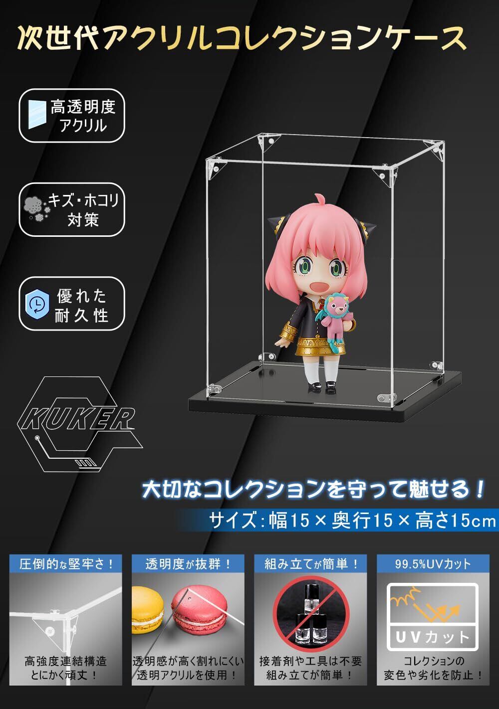 【在庫処分】KUKERフィギュアケース アクリルケース UVカット コレクションケース ディスプレイケース 組み立て簡単 頑丈 汚れ防止 手袋 クリーニングクロス付き(幅15×奥行15×高さ15cm,台座黒)