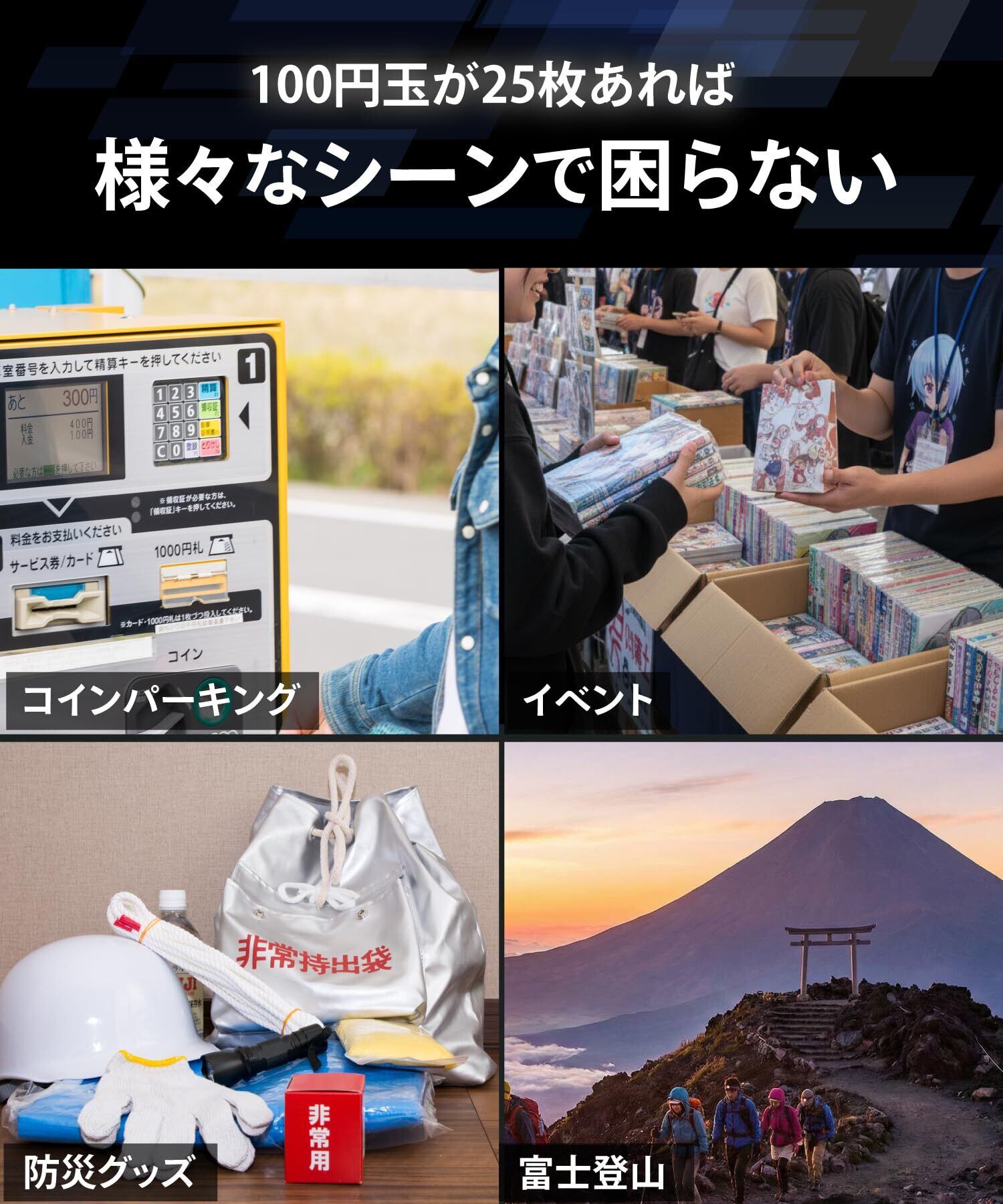 【様々なシーンで活躍】車に常備しておくことで、必要な時にすぐに取り出して支払いが可能です。特にコインパーキングでは100円硬貨の使用頻度が高いため、100円硬貨を25枚収納できる仕様により、スムーズな支払いをすることができます。また、ジムやランニング時に自動販売機で水分補給をする際にも便利で、手軽に必要な硬貨を取り出せるため、アクティブなシーンでも活躍する新しいコインケースです。