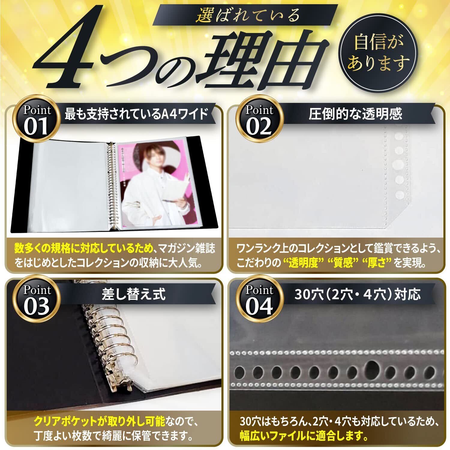 【皆様のお声を形にしました】A4変形ワイドとはA4ワイドやマガジンサイズとも呼ばれています。通常のA4サイズよりも余裕のある大きいサイズなので、大事な雑誌の記事なども切らずに収納できるため、スクラップをするのにとても便利なサイズなんですアイドル誌や映画誌、海外雑誌のスクラップ時によくある、もうちょっと綺麗に収納できたのに・・・そんなお声にお応えすべくサイズはもちろん“透明度”や“質感”、“厚さ”まで使いやすさと保管のしやすさをこだわりました!!!