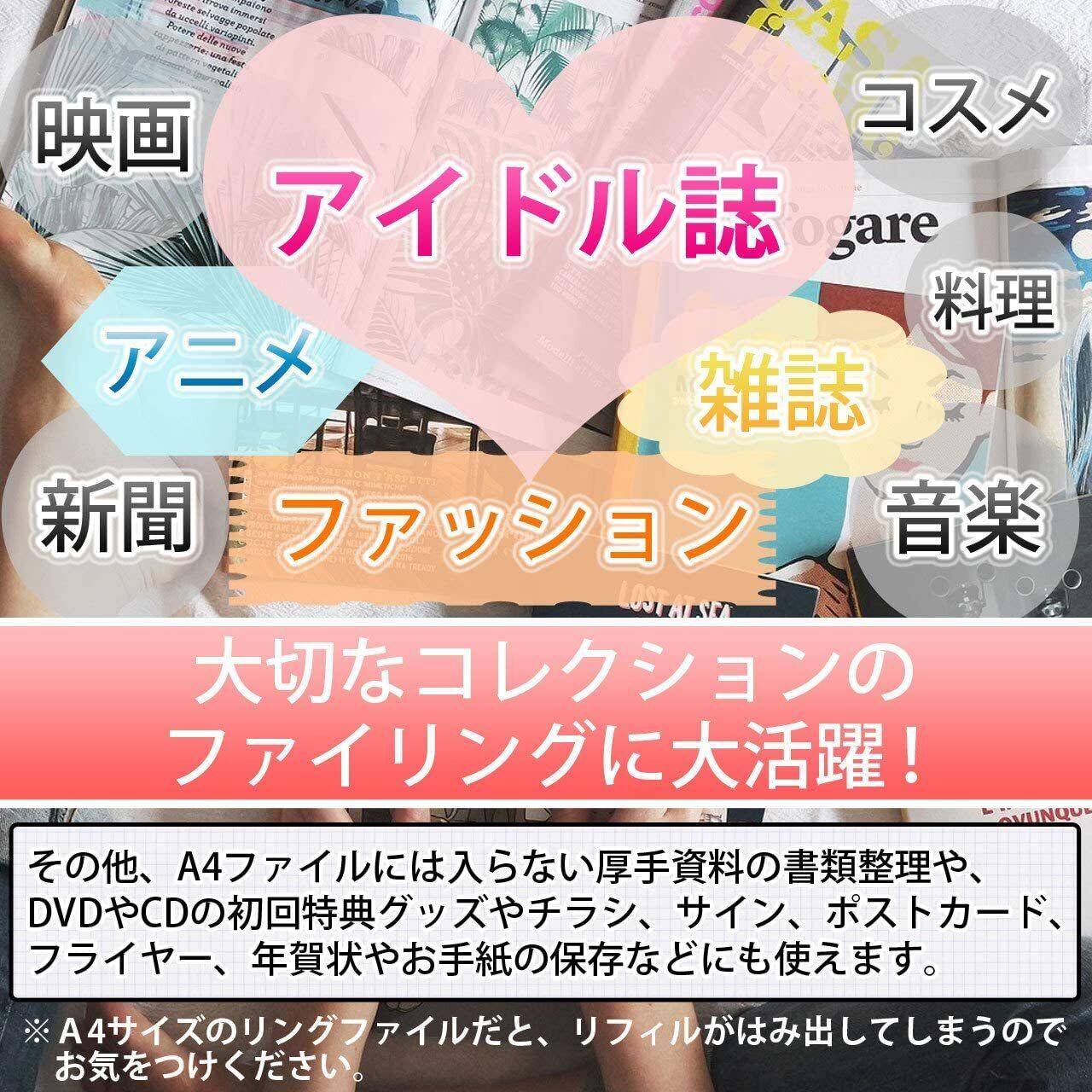 【おススメの収納用途】アイドル誌 アニメ ファッション 新聞 映画 コスメ 料理 音楽 雑誌などにその他にも、A4ファイルには入らない厚手資料の書類整理や、DVDやCDの初回特典グッズやチラシ、サイン、ポストカード、フライヤー、年賀状やお手紙の保存などにも使えます。