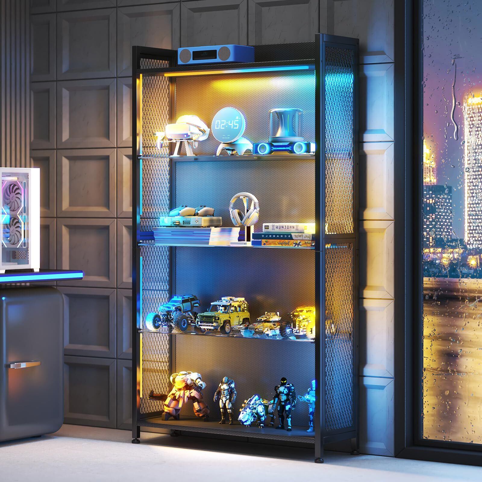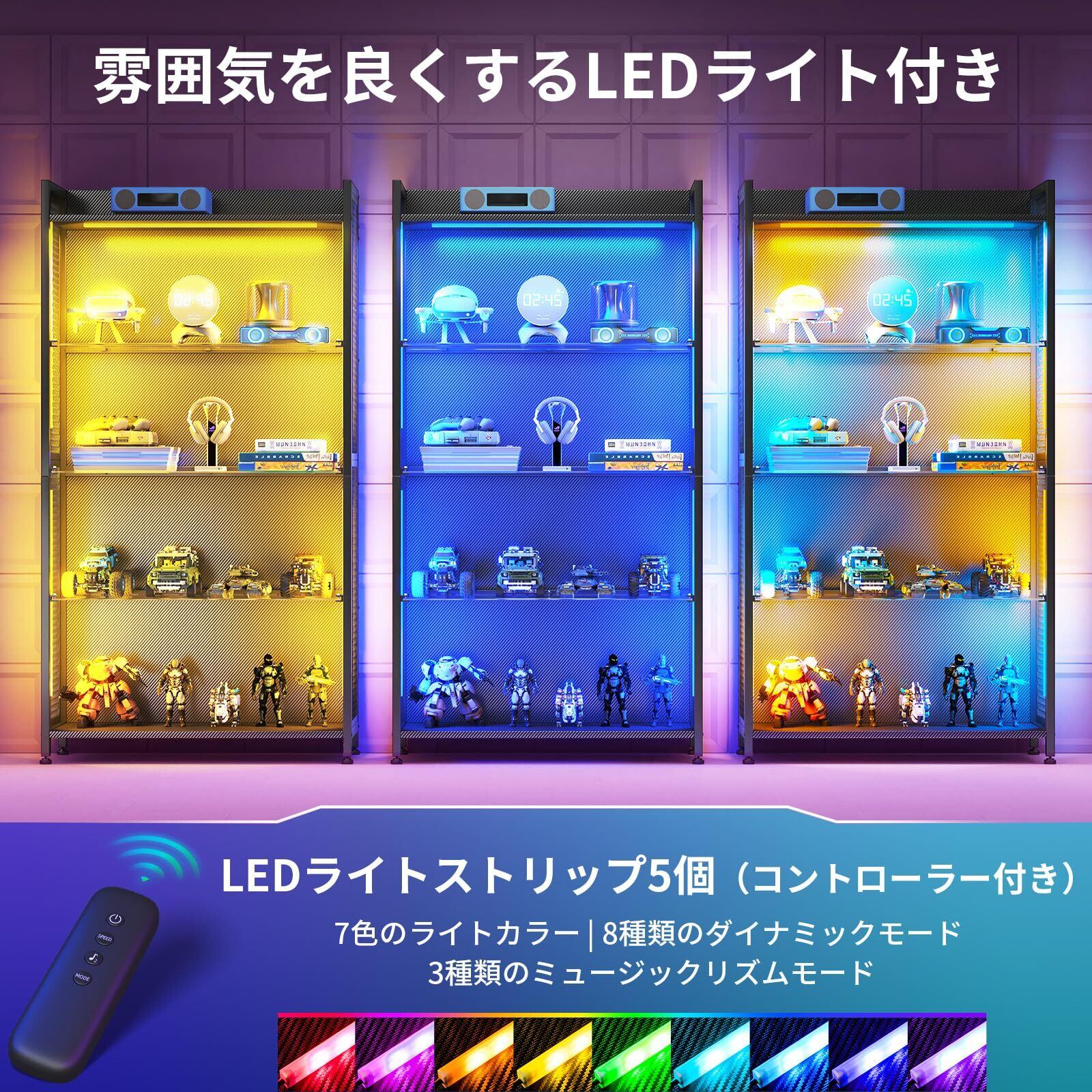 【LEDミュージックライト】内蔵された高輝度LEDライトが、コレクションを美しく照らし出し、お部屋の雰囲気を一変させます。リモコンで簡単に、7色のカラーチェンジと8種類の点灯モード(点滅、フェードなど)をお楽しみいただけます。さらに、音楽のリズムに連動して光が変化する3つのモードで、ゲームや音楽の世界に没入できます。