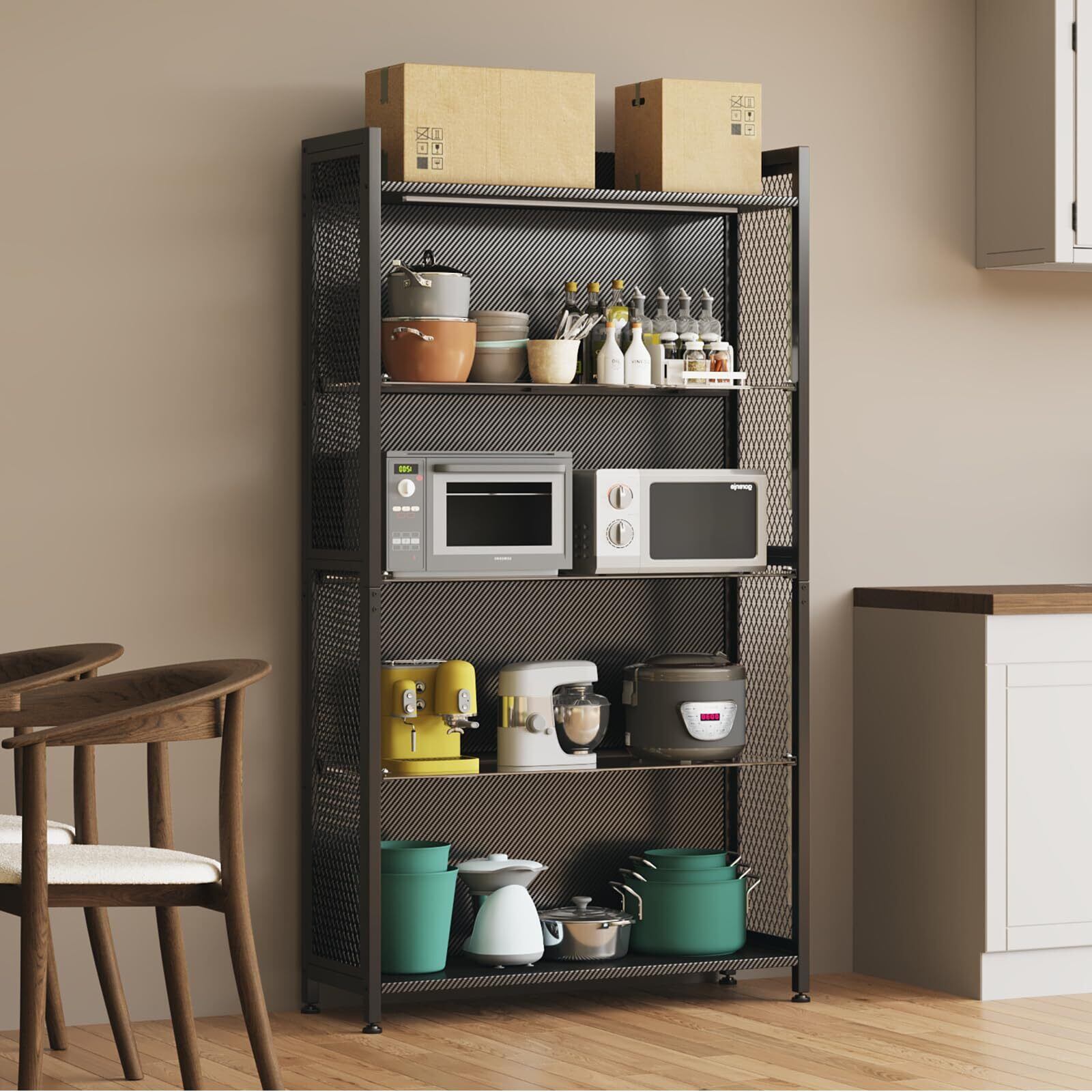 【鋼管フレーム&ガラス棚】主構造は耐久性に優れた鋼管フレームで、安定性抜群です。棚板はクリアな強化ガラスを使用しており、展示物を邪魔することなく美しく見せ、お手入れも簡単です。オープン設計でアクセスしやすく、収納物の出し入れがスムーズです。