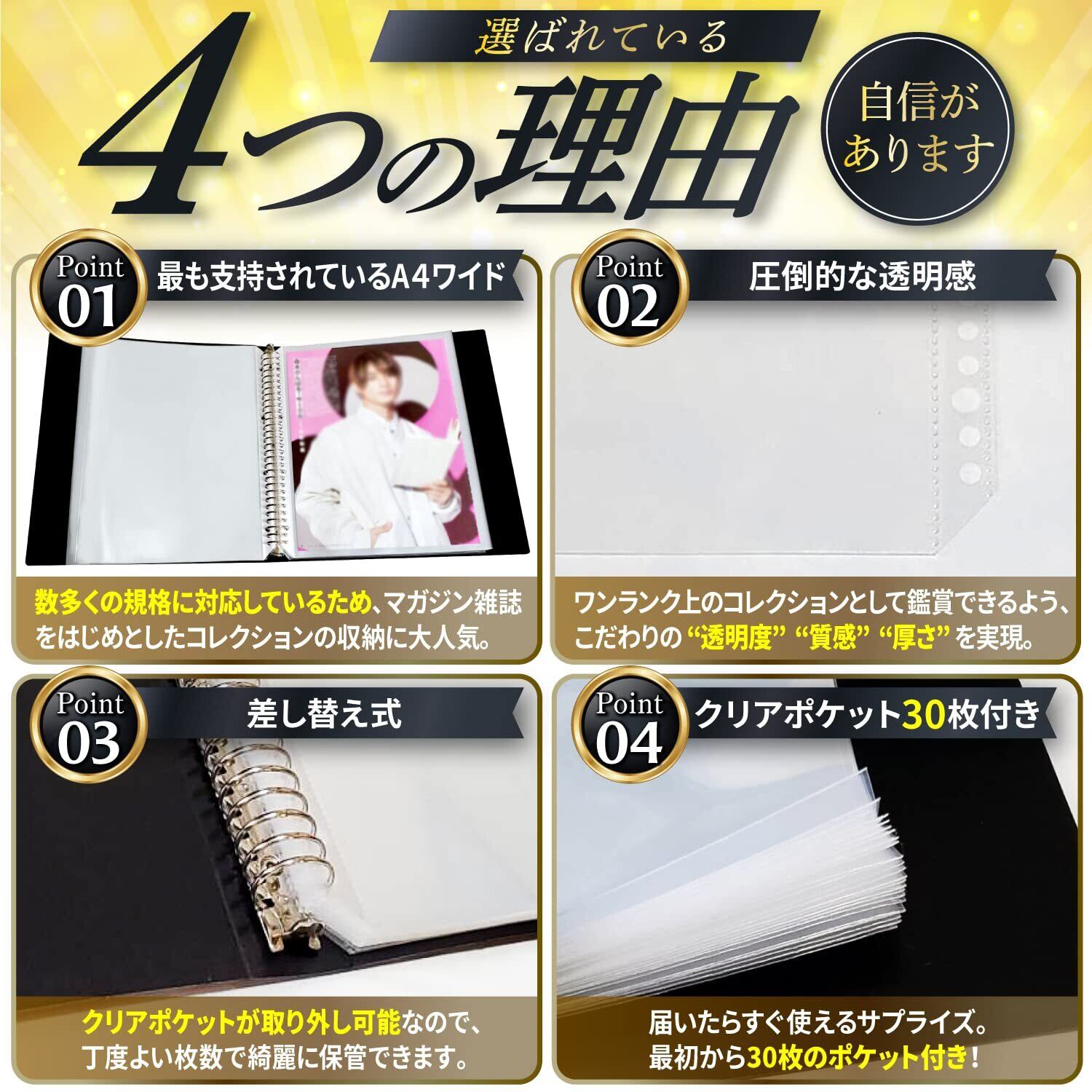 【マガジンサイズの切り抜きに】マガジンファイルには、容量・透明度・厚み・質感にこだわり抜いたA4変形ワイドのクリアポケット30枚入り!届いたらすぐに使えます!A4サイズはもちろん、A4サイズに入らなかったマガジンサイズにも対応しているので、アイドル誌の収納に大人気です大切な切り抜きやコレクションを高透明なファイル越しにクリアに眺められちゃいます!程よい厚みとコシもあるのでめくりやすいですよ!