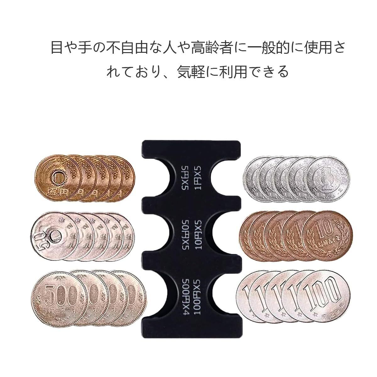 【2,775円を収納できるコインホルダー】この携帯用コインホルダーは、1円硬貨5枚、5円硬貨4枚、10円硬貨5枚、50円硬貨4枚、100円硬貨5枚、500円硬貨4枚を収めることができ、合計2,775円を整理して持ち運ぶのに便利です。硬貨を種類ごとに分けて管理でき、レジでの支払い後や金庫への持ち運びに最適なコインケースです。