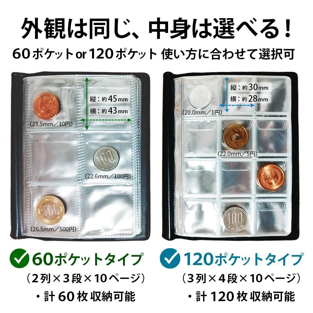 【収納スタイルに合わせて選べる、2タイプのポケット配置】 内部には10ページのコイン収納リーフを採用。1ページあたりのポケット配置は、 ・60ポケットタイプ(2列×3段 ×10ページ) ・120ポケットタイプ(3列×4段 ×10ページ) いずれもコインをしっかり保護するフラップ付きで、PVC素材のポケットは防水・防酸化仕様。大切なコインを長期的に守りながら、美しく保管できます。