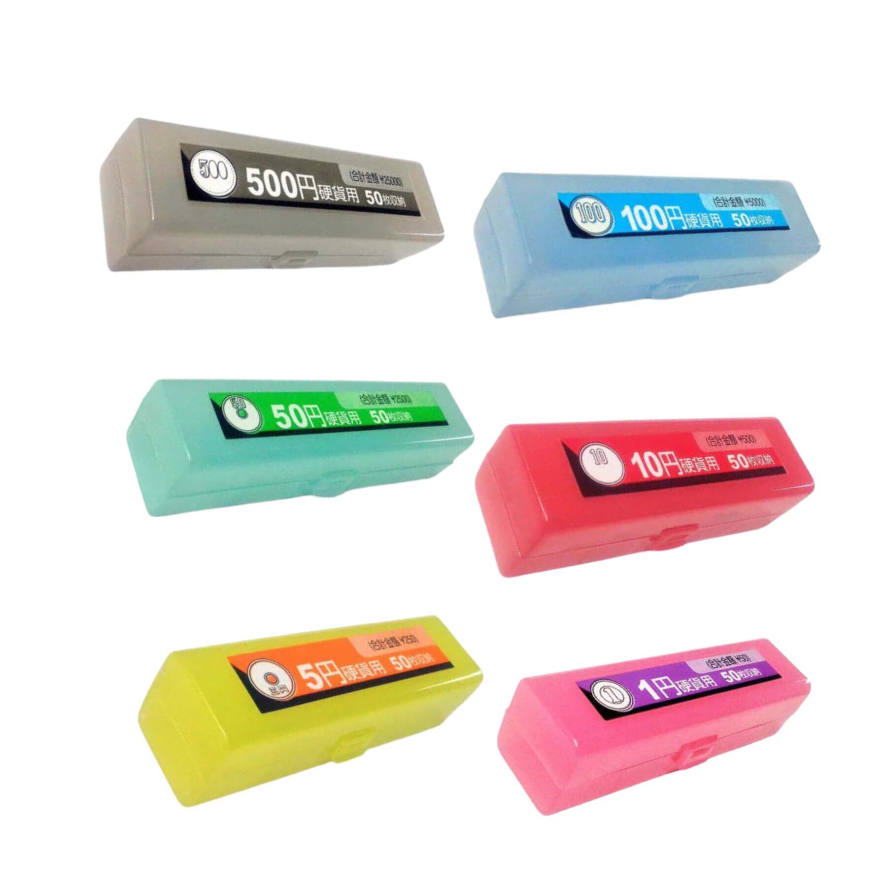 各硬貨50枚ずつ入る、角型の硬貨整理ケース6個セットです。